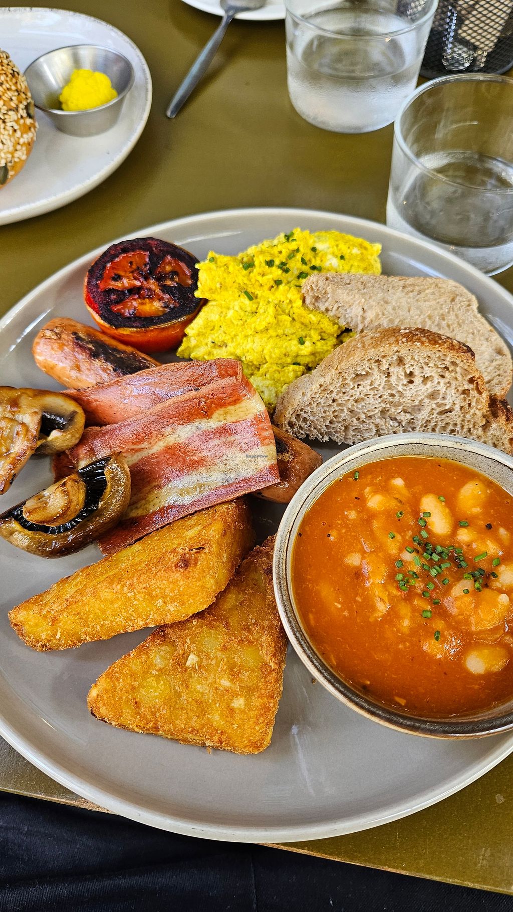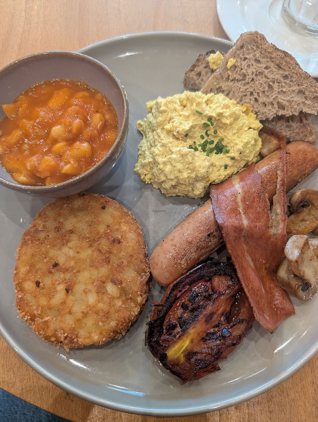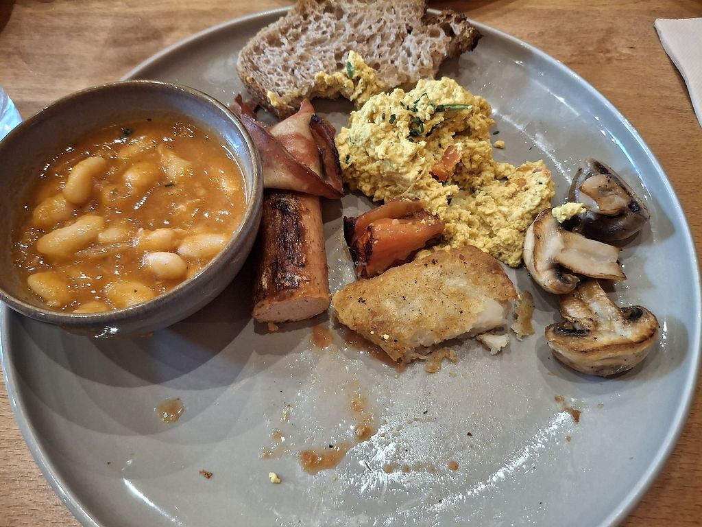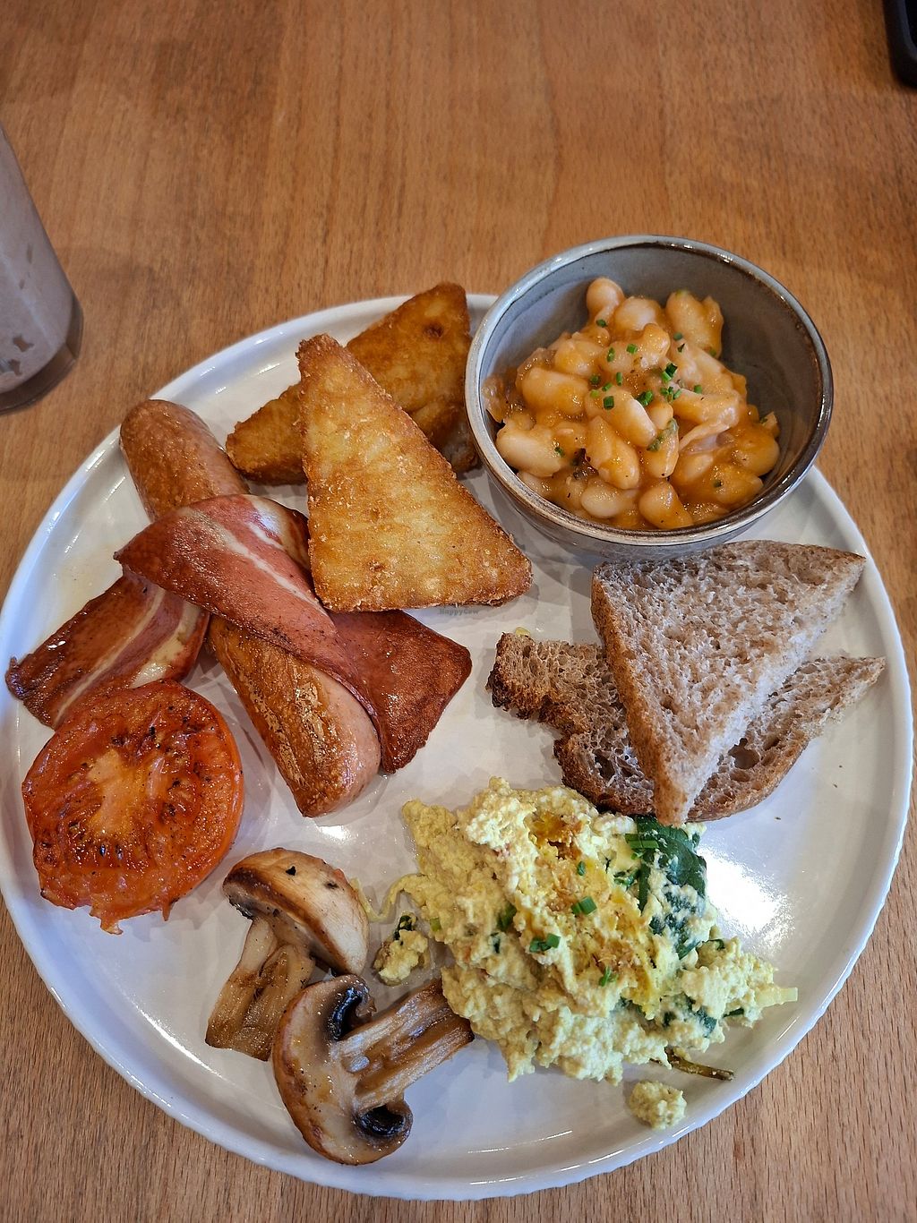 Pros: Vegan sausage, Home made baked beans, Crispy hash browns