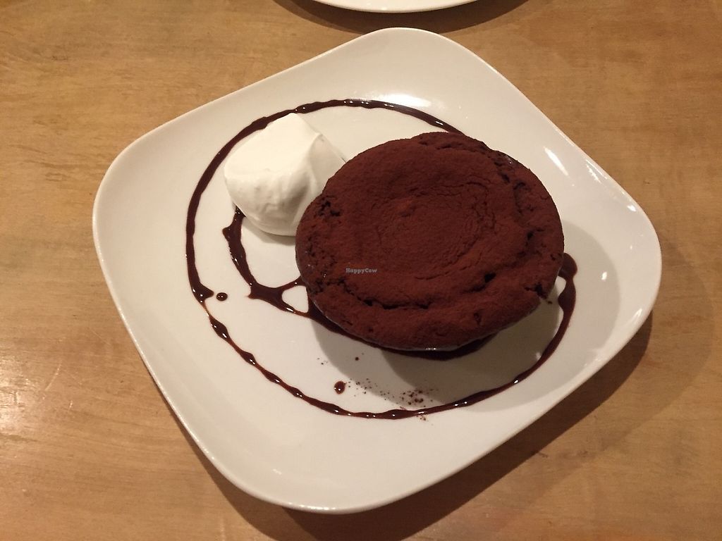 Perfect chocolate cake with soy whipped cream, darjeeling tea and beet…