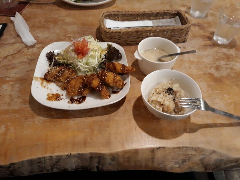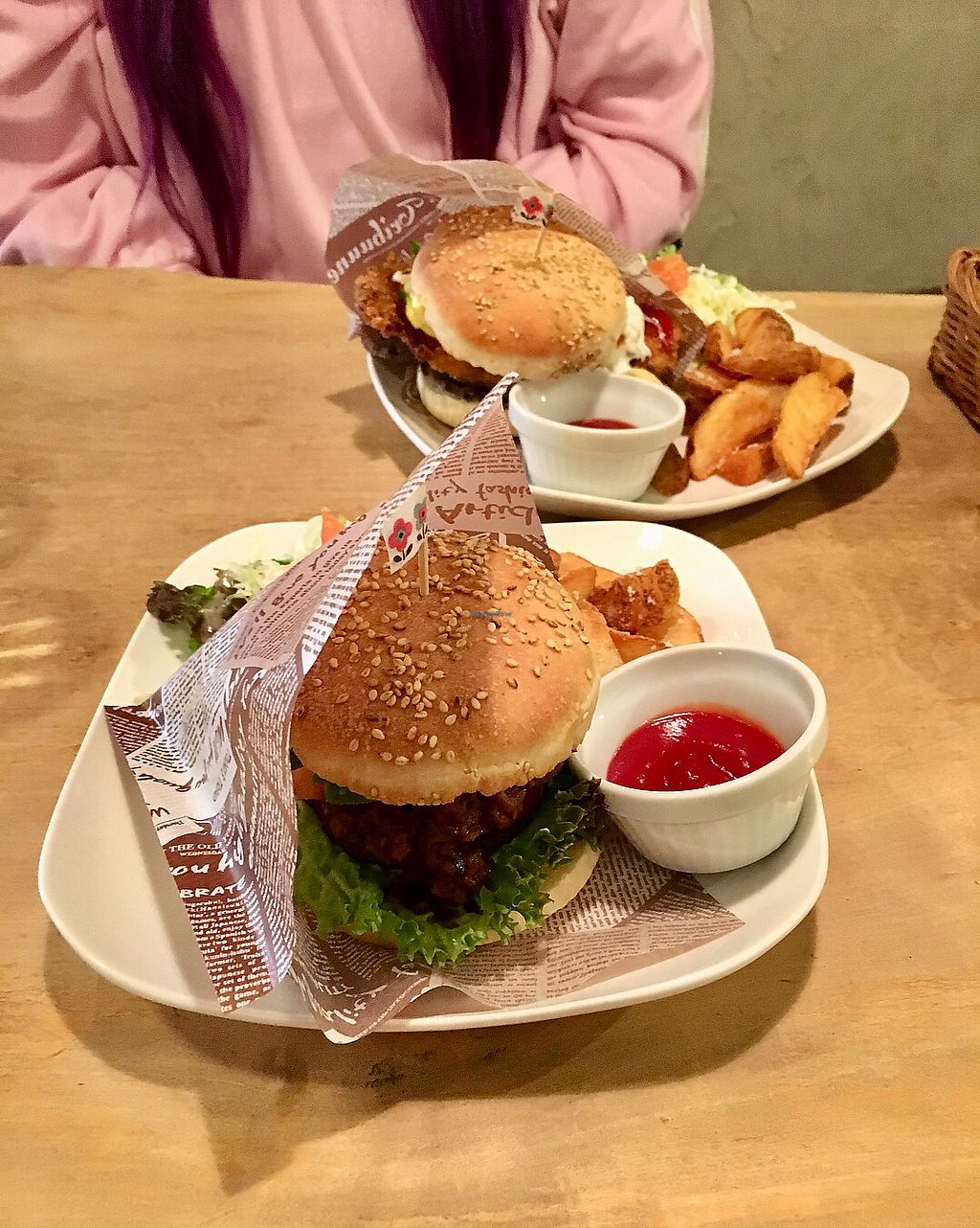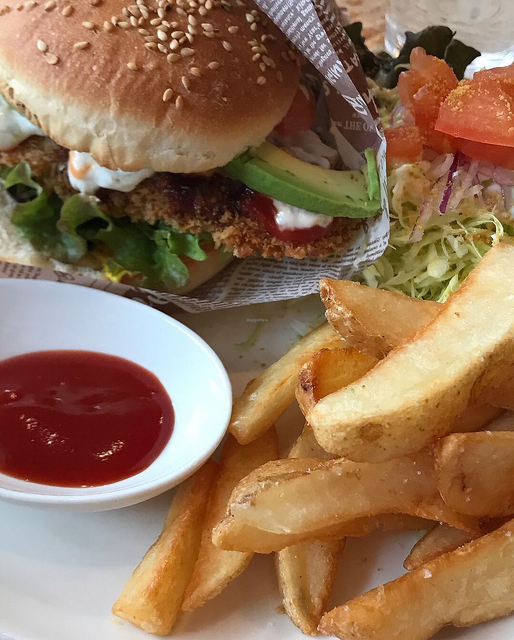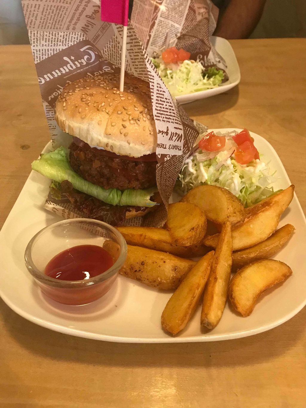 Vegan fish burger with baked potatoes and salad. Also a great banana s…