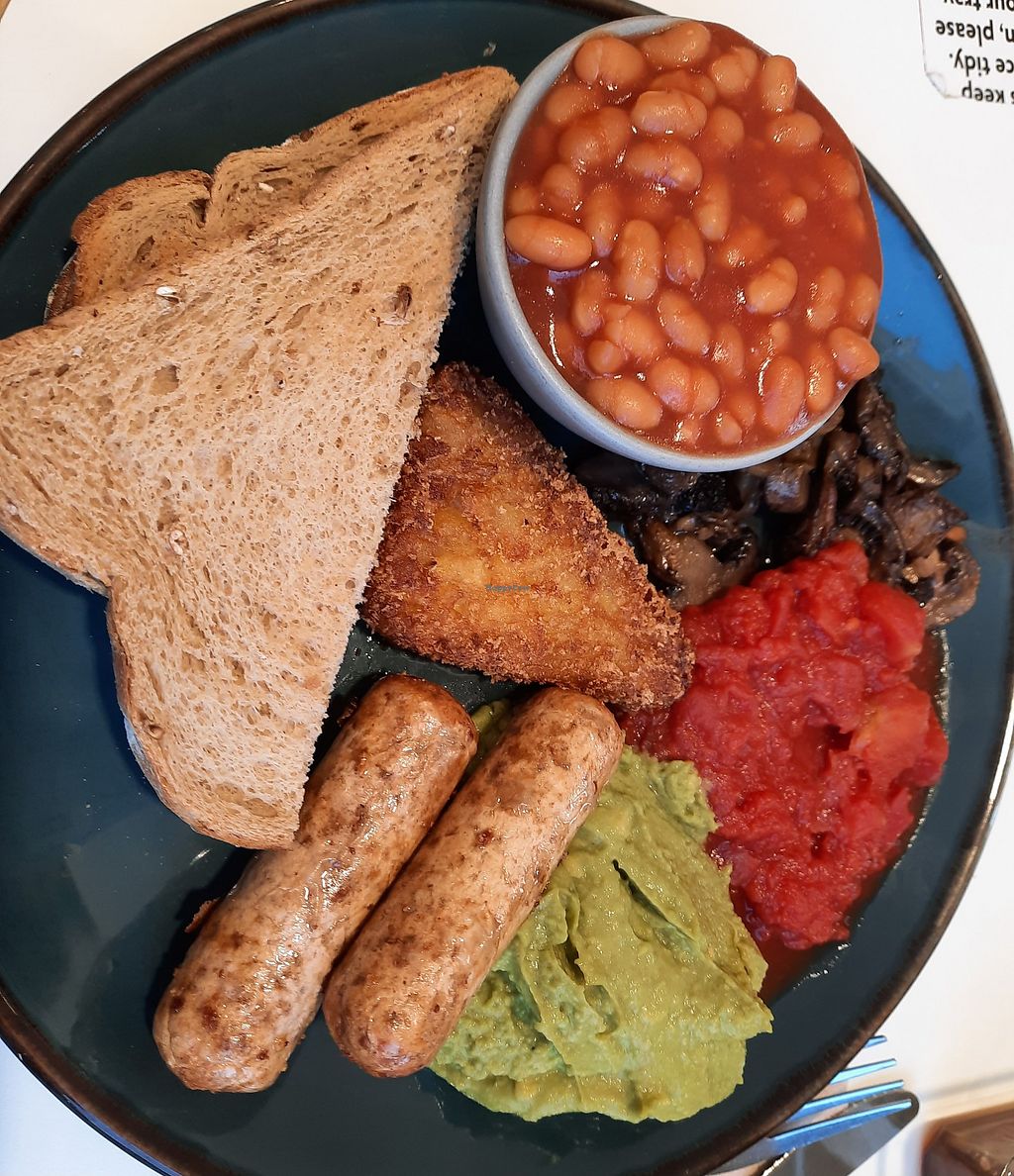 The vegan breakfast is very good. There were also options like a falafel burger and a falafel salad, but you can also veganise some veggie options. If you leave out the garlic bread from the veggie chilli, for instance, it's vegan.