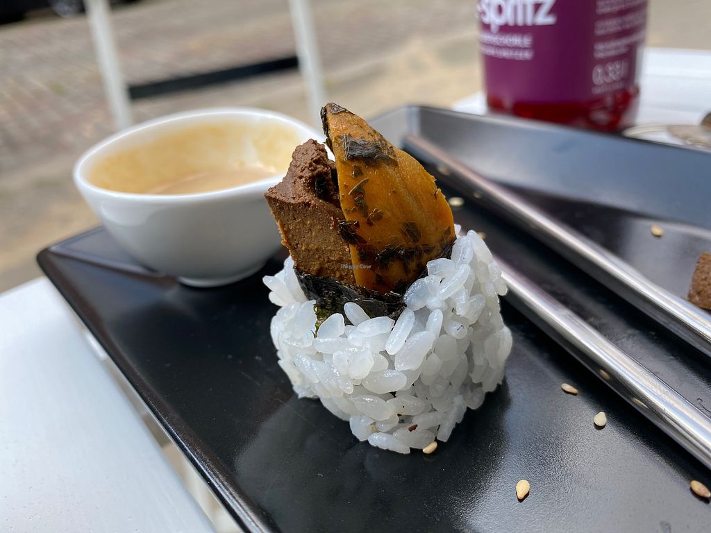 We bought the California roll with tofu and sweet potato with a croissant type of pastry as a little taster before the sushi came. It tasted very good. The homemade sauce was very good. One of the better vegan places in Hamburg