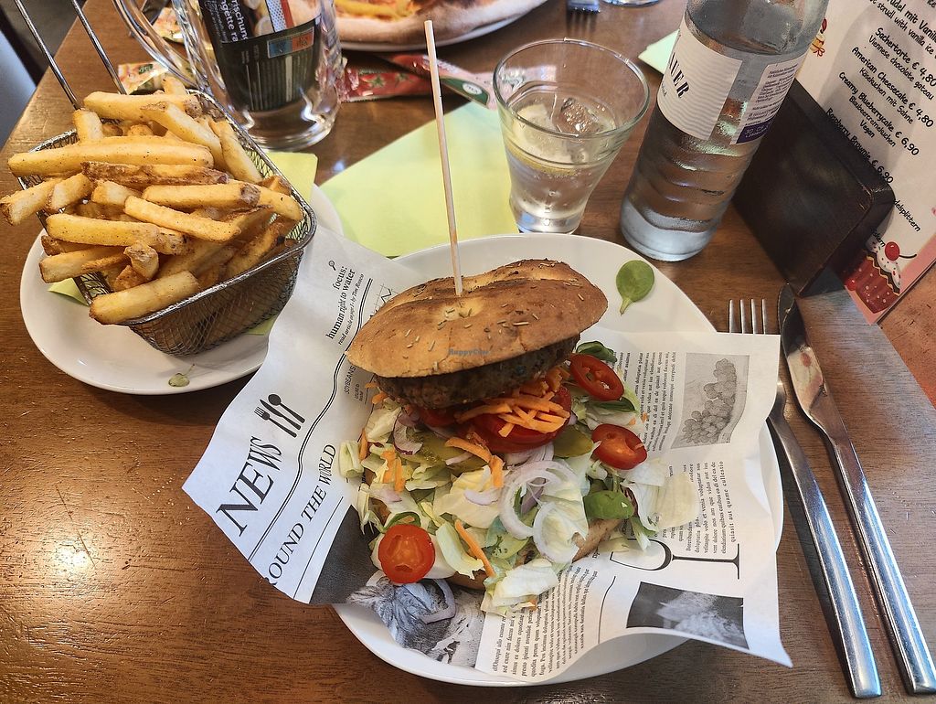 I found this place on HappyCow and decided to give it a try. We tried to book a table over the phone, but they told us they didn't take reservations and that we could just come over. Upon arrival, the place was very busy, but there was still one table available. It's a very large restaurant, but the service was really fast. The vegan options weren't labeled as such on the menu, but we were lucky that the waitress knew exactly what was vegan and what wasn't: the green oat burger is standardly vegan, the Mediterranean burger too if you omit the mozzarella, then you also have the Thai red curry and two different pasta's if you leave out the cheese.