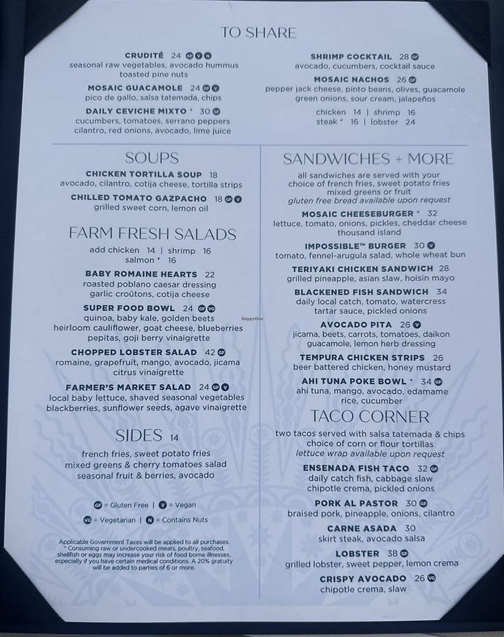 Serves meat, vegan options available. Offers clearly labeled vegan dishes such as chilled tomato gazpacho soup, mozaic guacamole, farmer’s market salad, Impossible burger, and avocado pita sandwich. Open Mon-Fri 11:00am-5:00pm, Sat-Sun 11:00am-8:00pm.