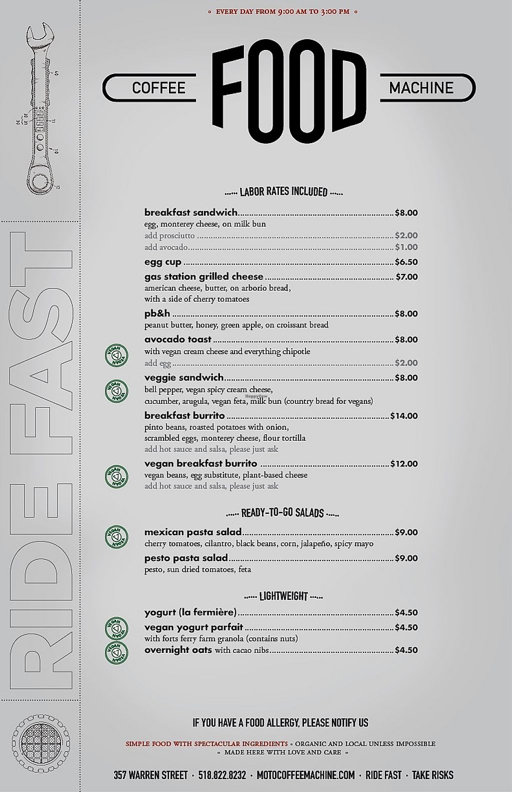 Serves meat, vegan options available. Motorcycle shop, coffee bar, and restaurant with some vegan options, such as an artichoke and olive tapenade sandwich, grilled vegan cheese and jalapeño sandwich, and more. Open Mon-Sun 8:00am-6:00pm.