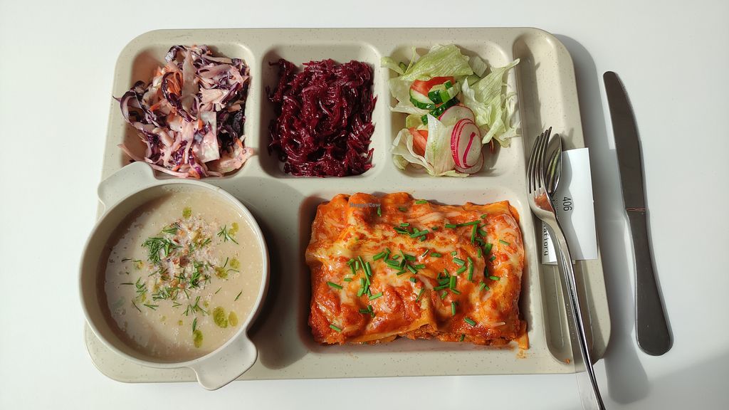 It's a modern university cafeteria that offers 5-6 dishes every day and there is always at least one vegan option marked by a green leaf icon. The set contains of soup, salad and the main dish. The portions are decent and the price is 6-7 euros for the set. Overall, it's a good deal and the place is worth visiting.