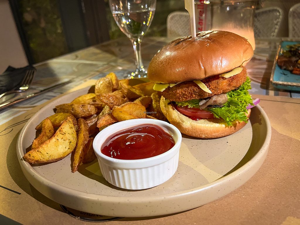 Vegan burger and fried potatoes