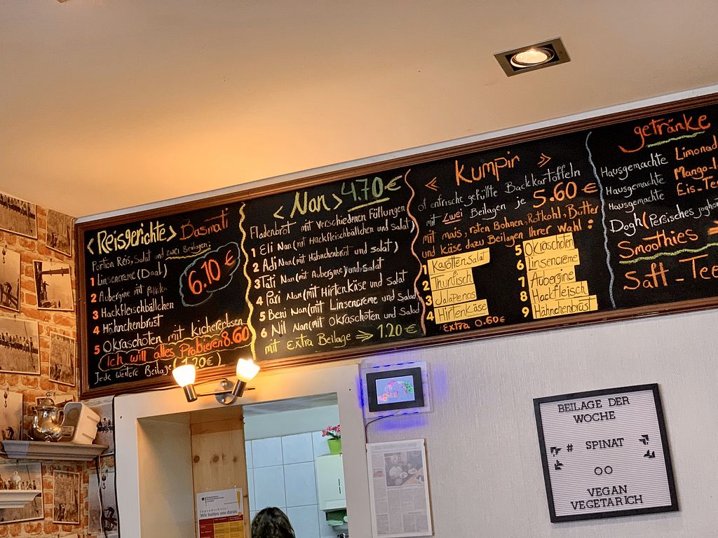 Real, fresh food, no health yuppie stuff. Potatoes (kumpir) or bread (nan) or rice plus veggies. Friendly staff, small kitchen, around 30 seats inside and 6 outside. 5 mins f/ central train station in nice, normal part of town. No fancy lemonades but Coke, Fanta, Red Bull, etc. Would get five stars from me for down-to-earth, friendly, cozy atmosphere.
