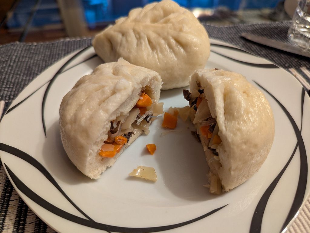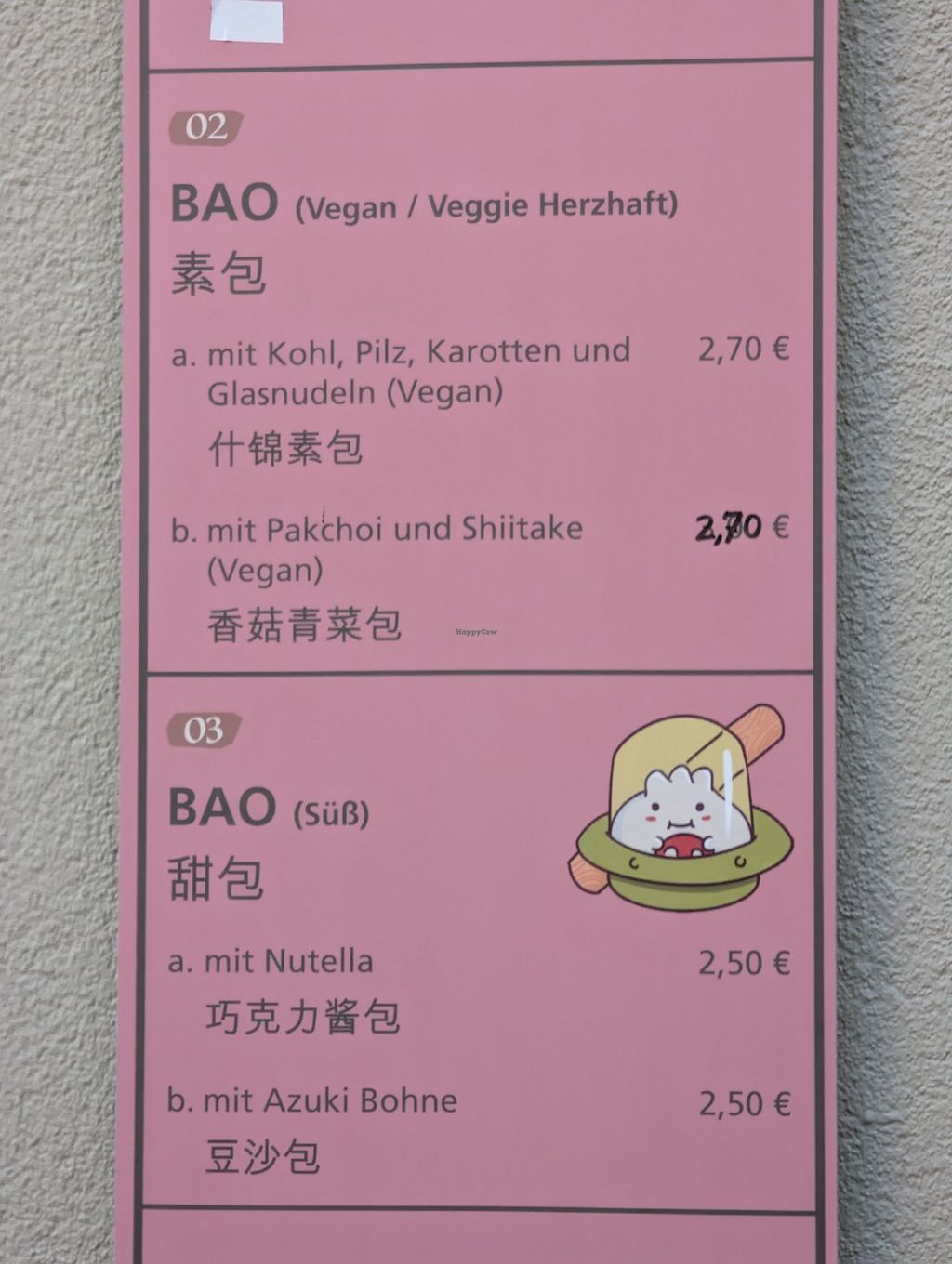 Es gibt 2 verschiedene vegane Sorten Bao Buns. Besonders die mit Shiitake und Pak Choi sind lecker! Verschiedene Sorten Bubble Tea, allerdings keine veganen Optionen beim Milchtee.