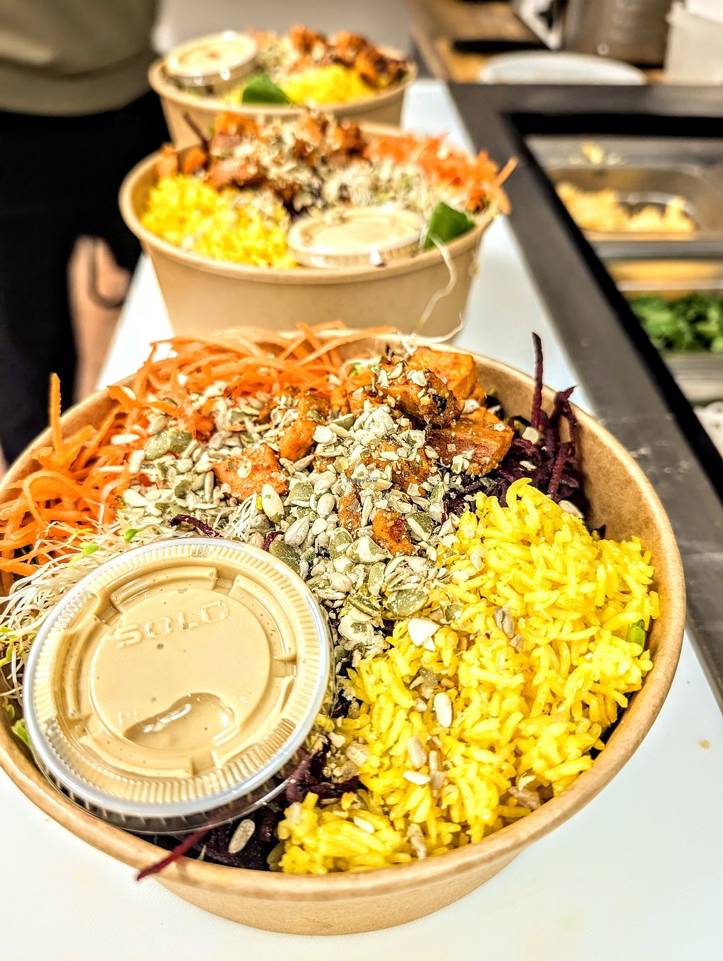 The Thai bowl was basically dry spinach on the bottom, with pad Thai noodles, and a few carrots and cucumbers. The noodles had almost no peanut dressing.