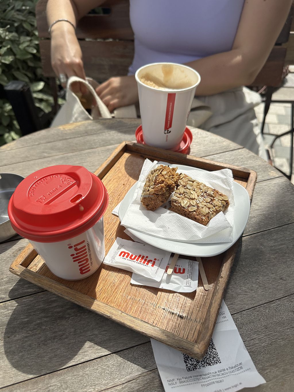 Coffee with soy milk and a grain/nuts snack.