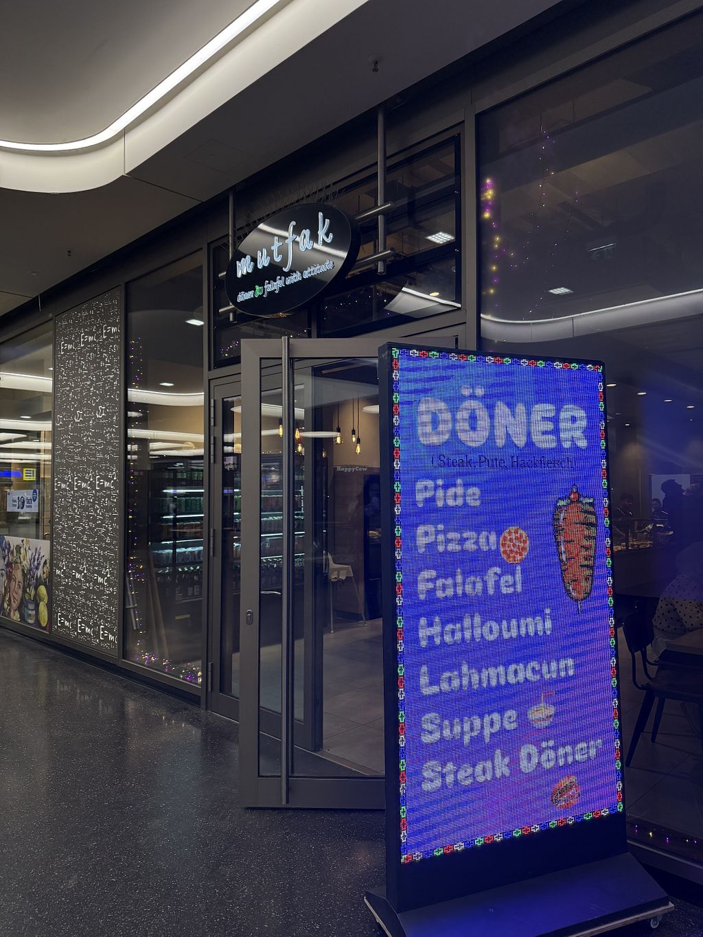Lacto Ovo Pizza Fast food Take-out Middle Eastern Non-veg Serves meat, vegan options available. Döner joint offering falafel, falafel döner, yufka, and salads. Open Mon-Sat 11:00-21:00. Closed Sun. More