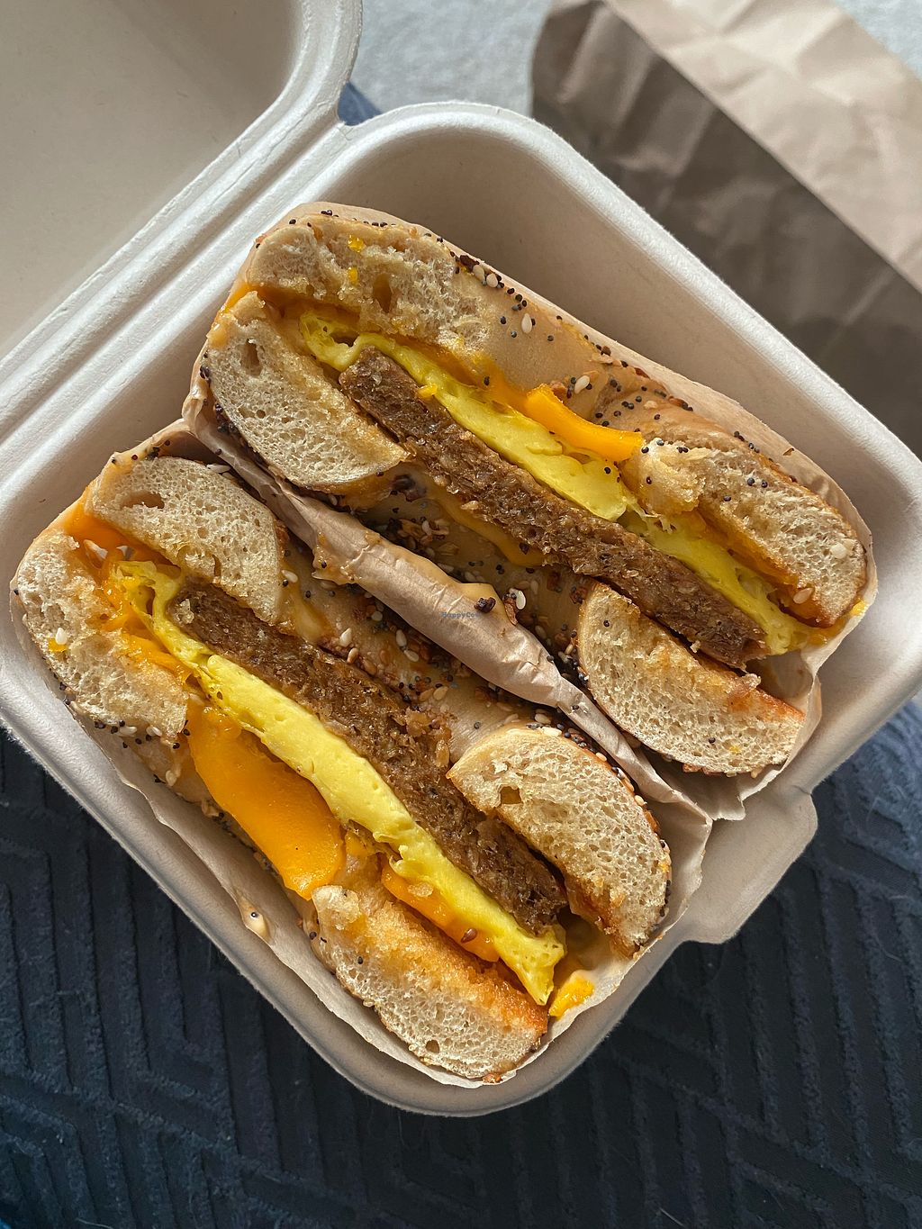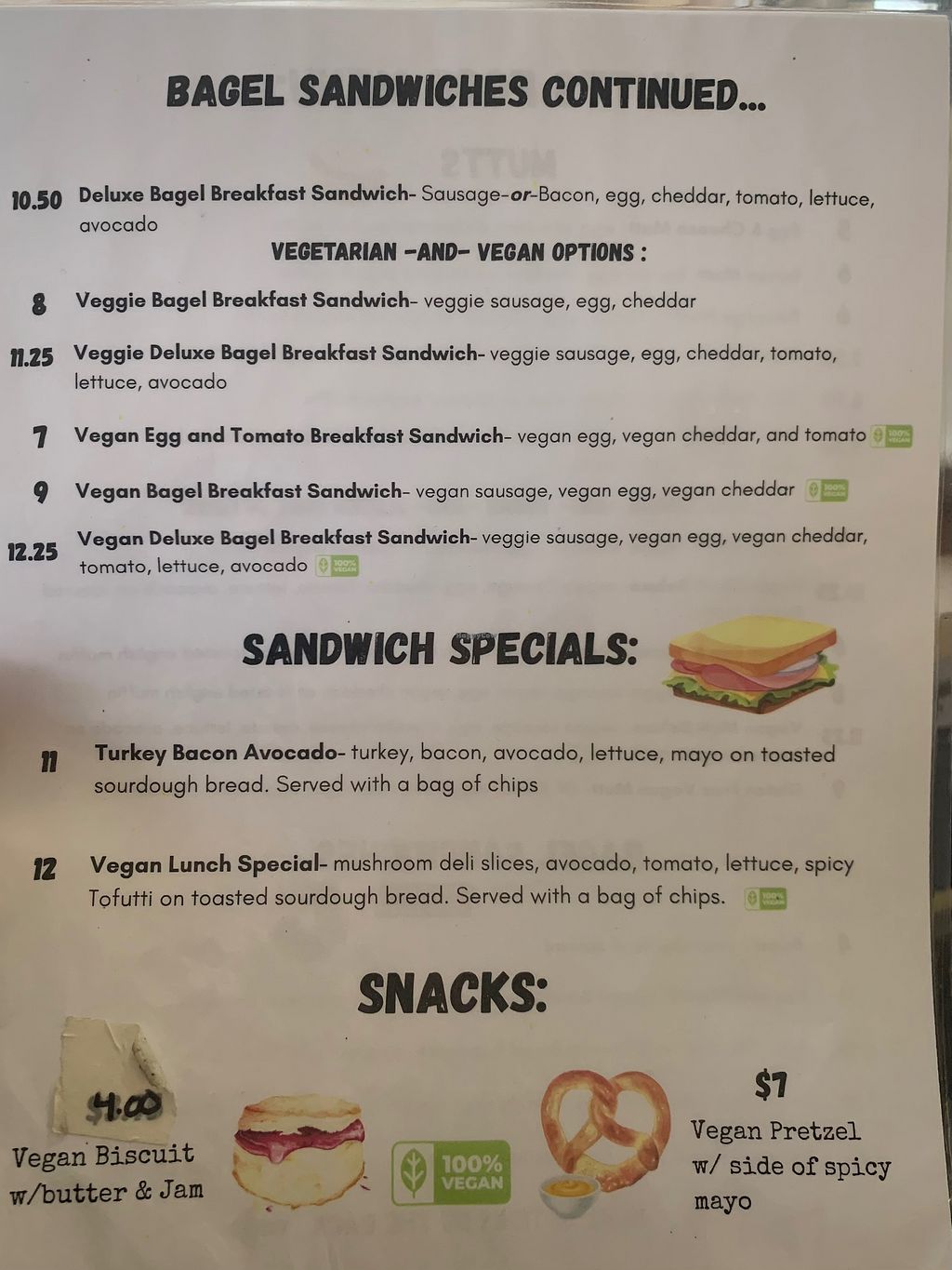 Husband and I enjoyed the vegan deluxe sandwiches on a plain bagel and an English muffin. Both were very tasty! The avocado was smashed and there was plenty! There are different vegan option for spreads and everything was clearly marked.