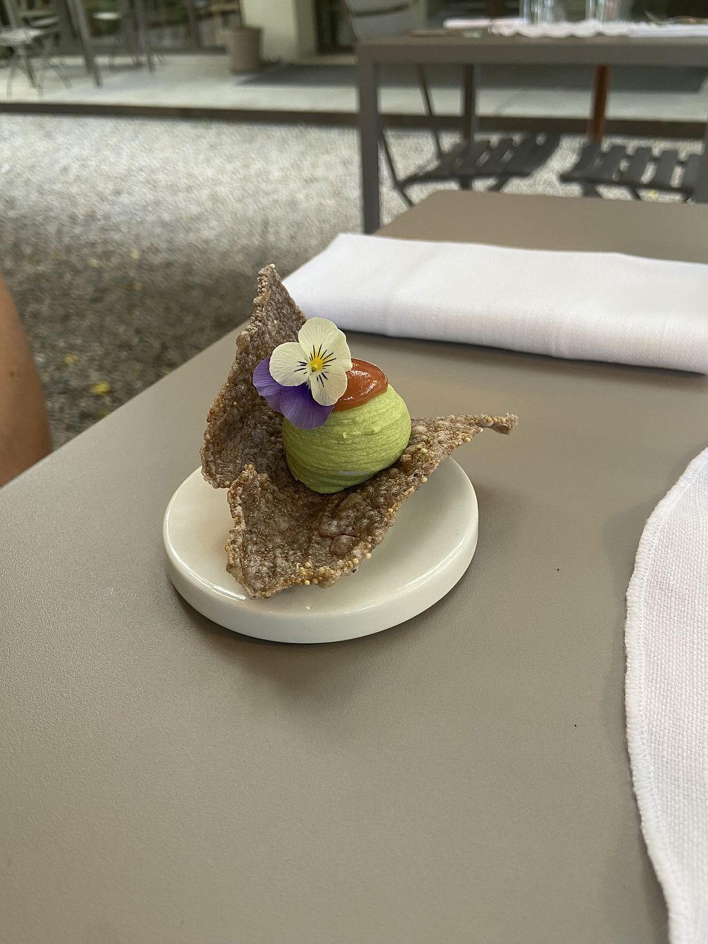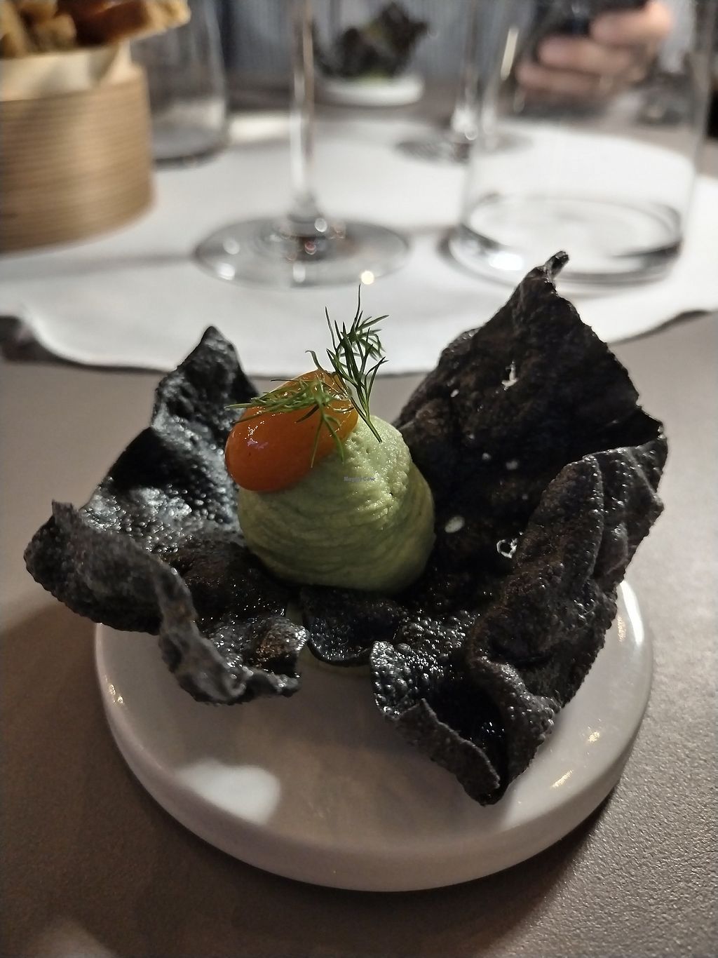 Entrée edamame, candy apricot and black carbon chip