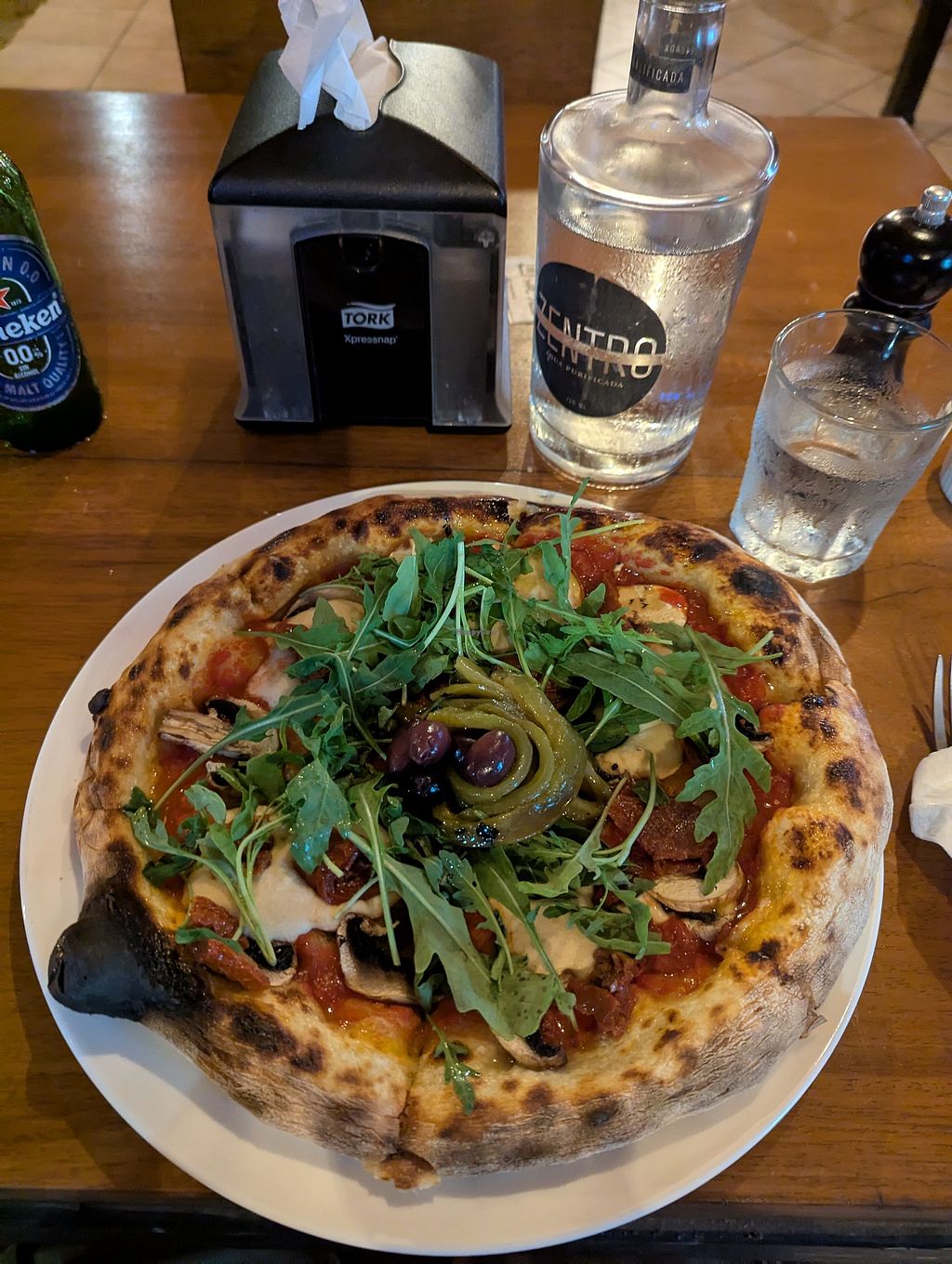 Vegan pizza with Cashew vegan cheese alternative. Baba Ganush starter also vegan.