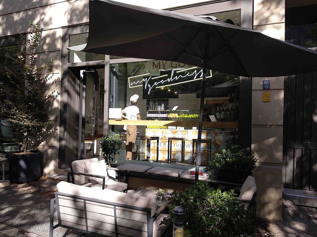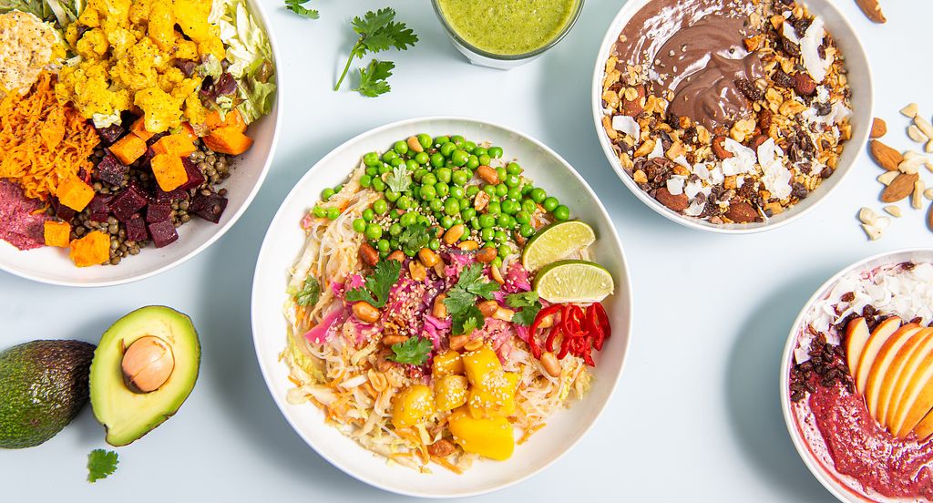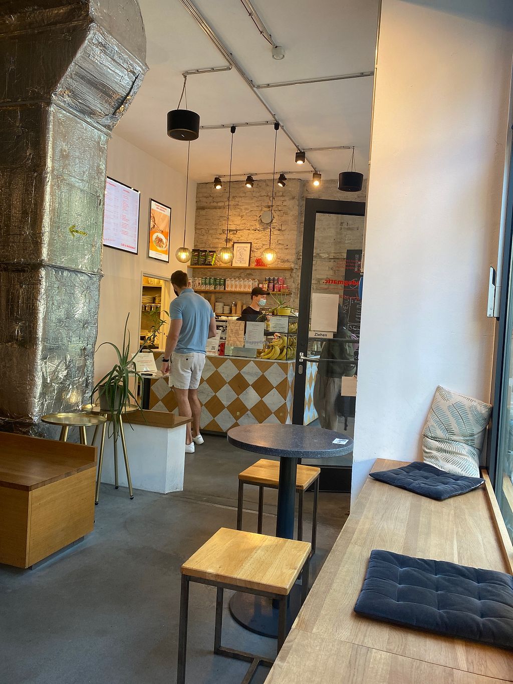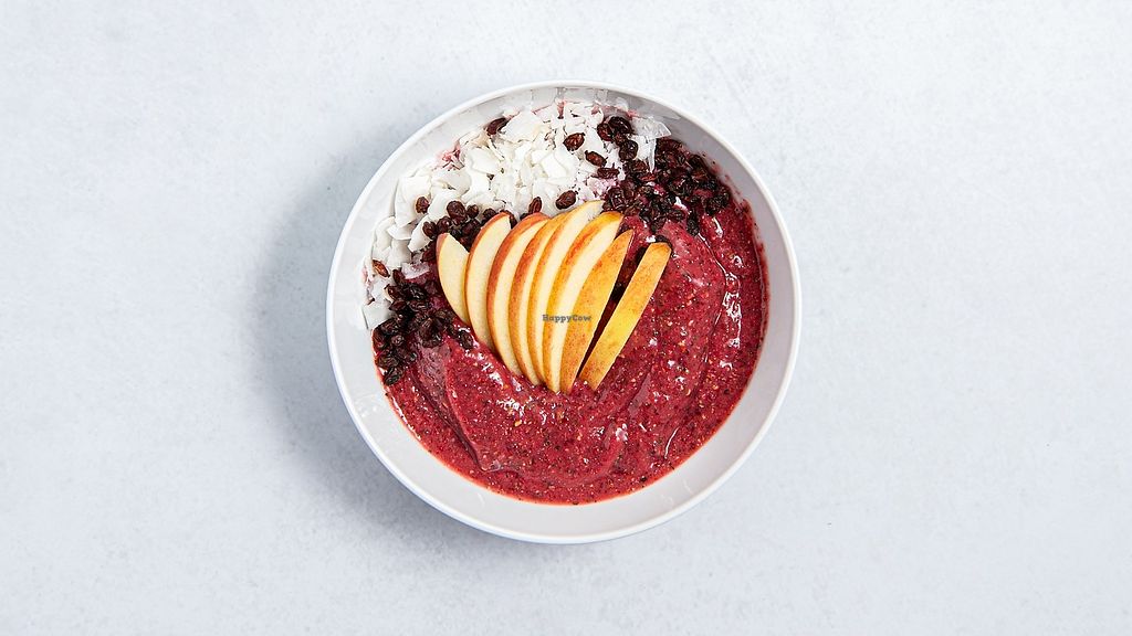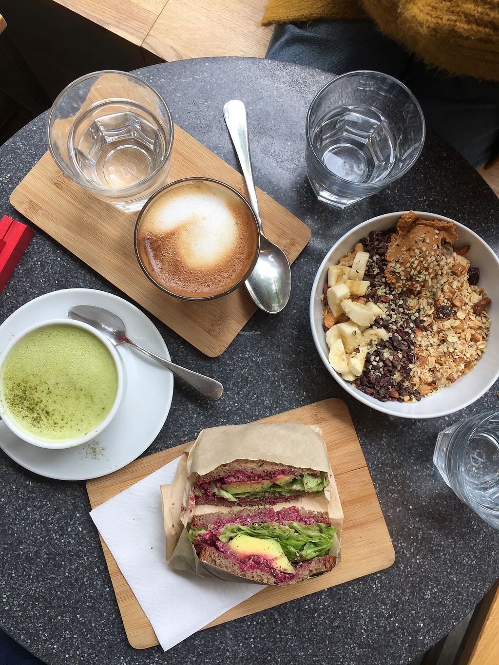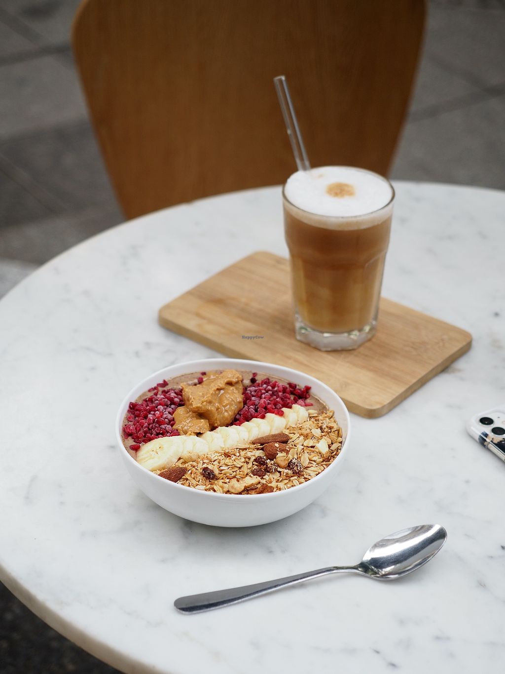 turmeric latte, overnight oats (plum preserves), and acai bowl with ap…