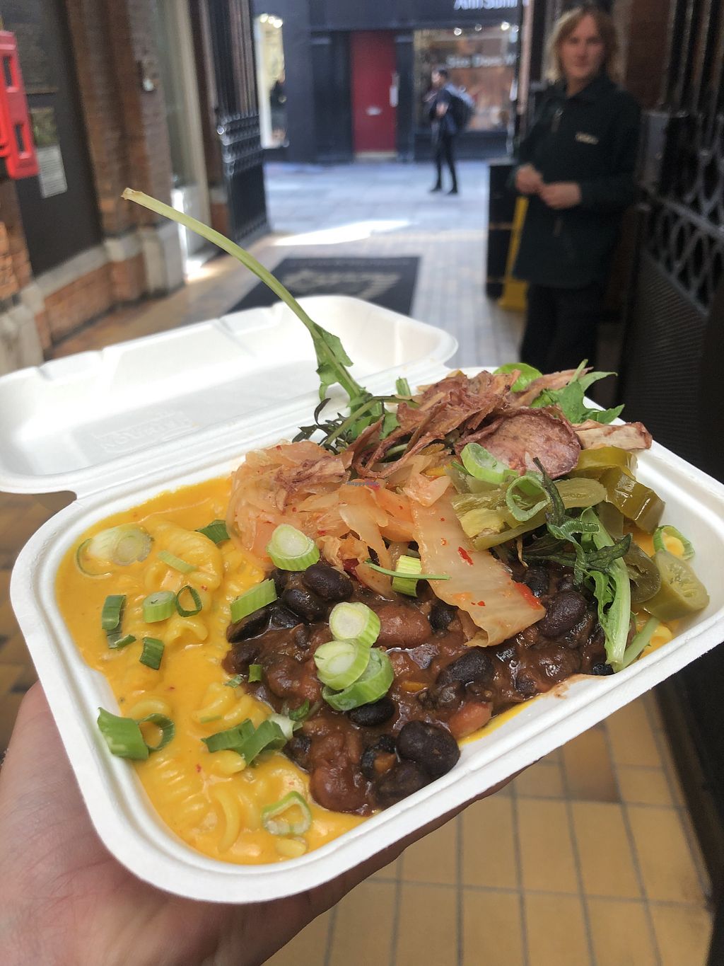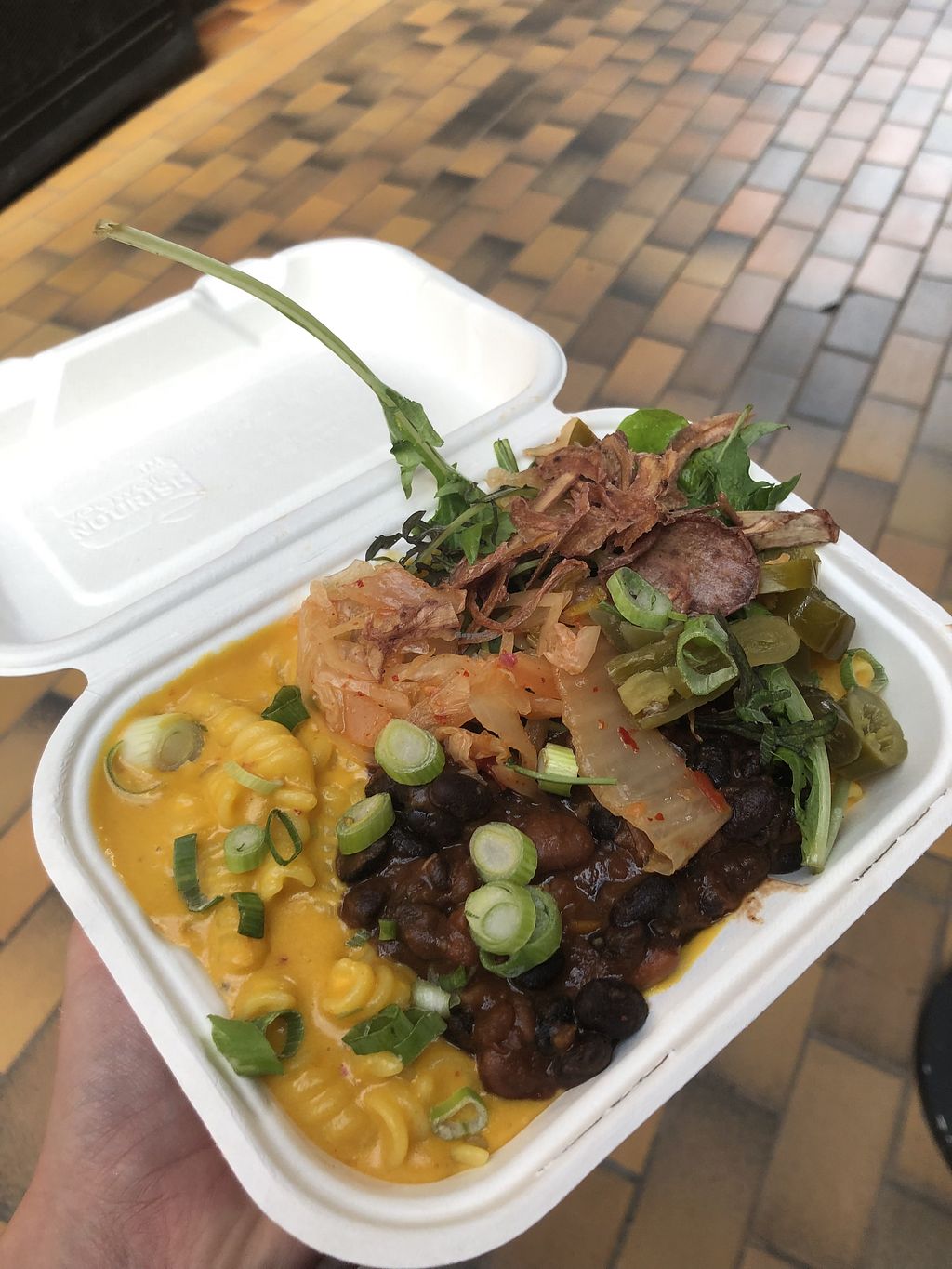 I had the kimchi Mac with the mushroom “drum stick”. By far the best vegan Mac and cheese I’ve ever had and I’ve had a lot! Super flavorful and savory. Kombucha was also amazing. People working there were super nice too😄