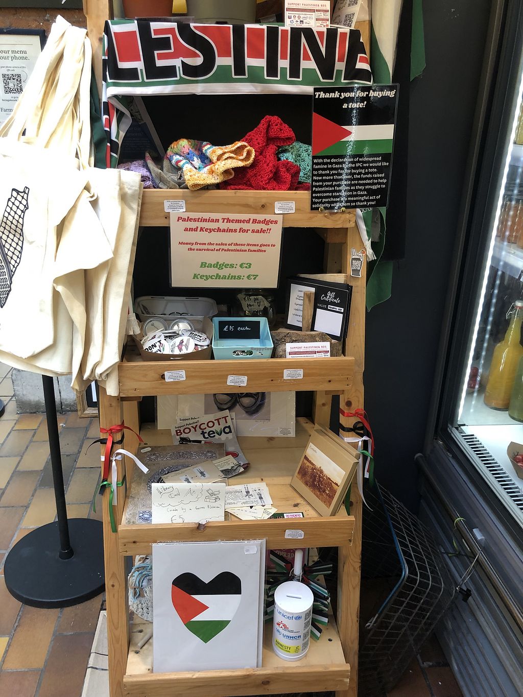 good range of tasty warm food and lots of raw cakes, had really nice nachos with kimchi and great cheese alternative. Small range of art/creative stuff available to purchase with proceeds going to Palestinian solidarity 🇵🇸👍👍