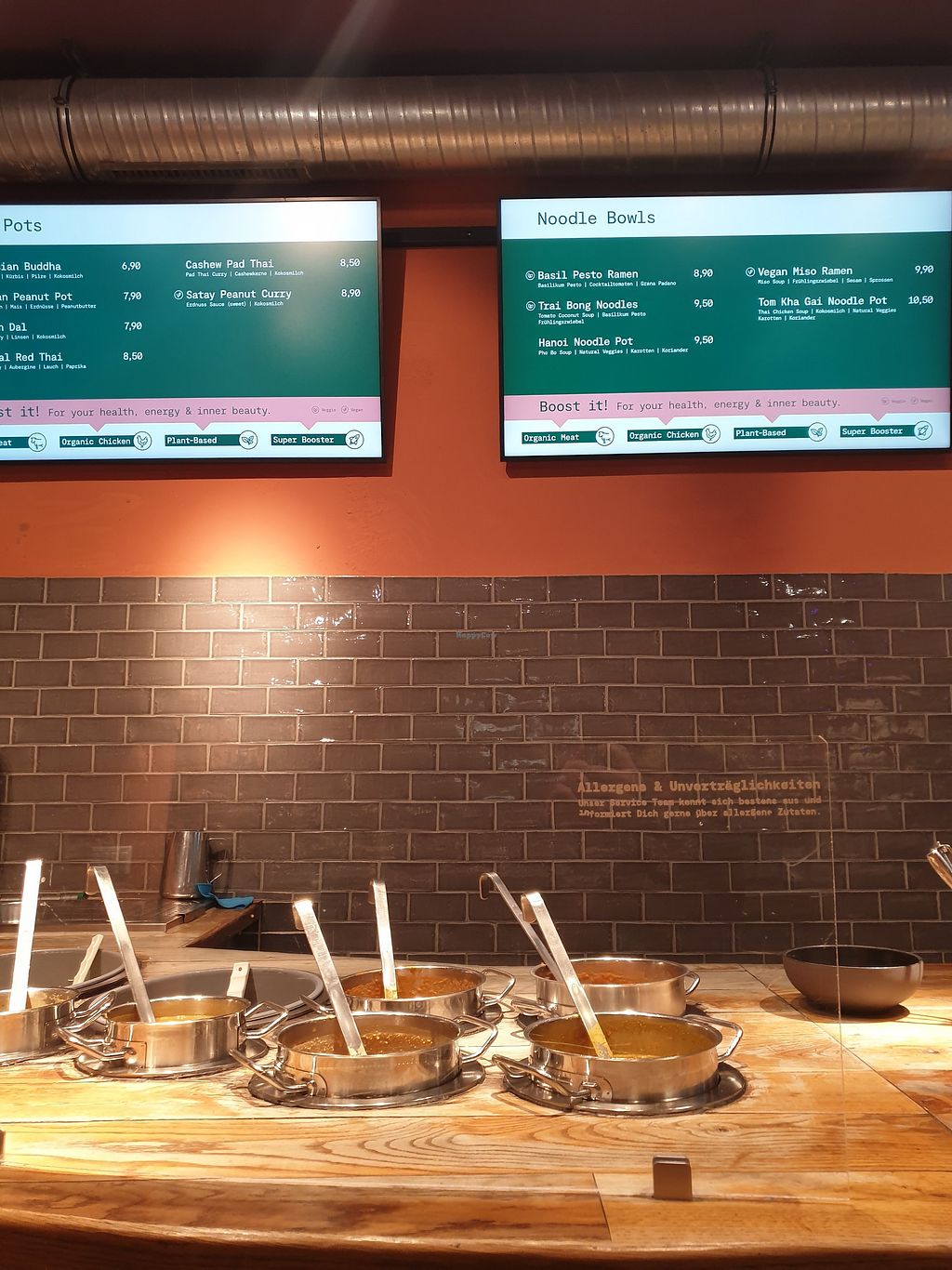 Serves meat, vegan options available. Casual dining Asian fusion cuisine chain restaurant. Menu offers curries, sushi, poke and grain bowls, stir fries, and salads including some labeled vegan choices. Some items are customizable. Example of dishes vegans could ask for include: lemongrass noodle pot, rice salad veggie, quinoa energy rolls, African peanut pot, dal mass pot, and vegan dark chocolate truffle for dessert. Open Mon-Sat 11:00-22:00, Sun 11:00-21:00. Closed Sun.