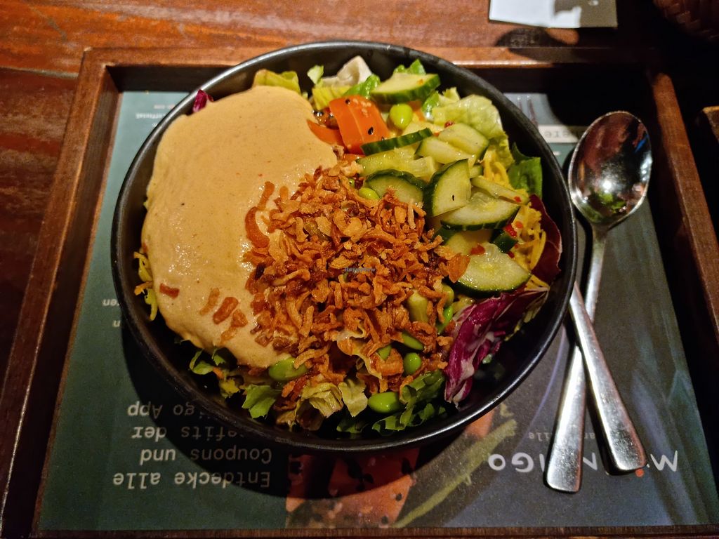 Wir sind gestern zufällig an dem Café (Imbiss) vorbei spaziert und haben uns spontan entschieden dort zu Abend zu essen. Wir haben uns für das indische Daal und die Erdnuss Bowl entschieden, beides jeweils mit Reis. Das Essen war super lecker und man ist gut satt geworden. Die Bedienung war sehr freundlich und herzlich. Wir kommen gerne wieder, falls wir mal wieder in der Gegend sind.