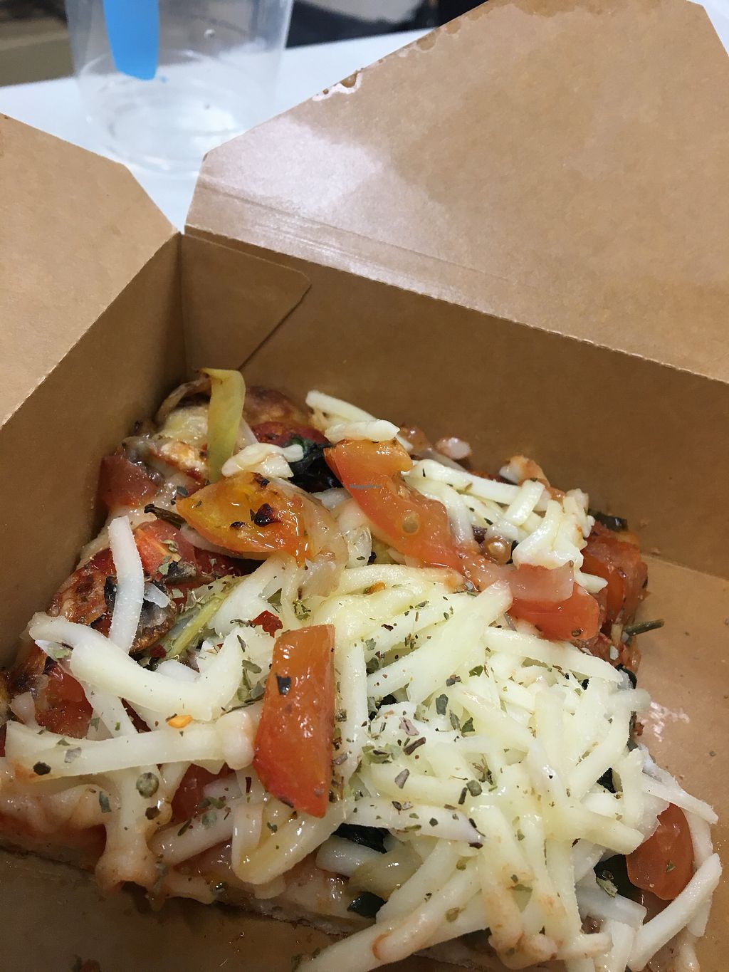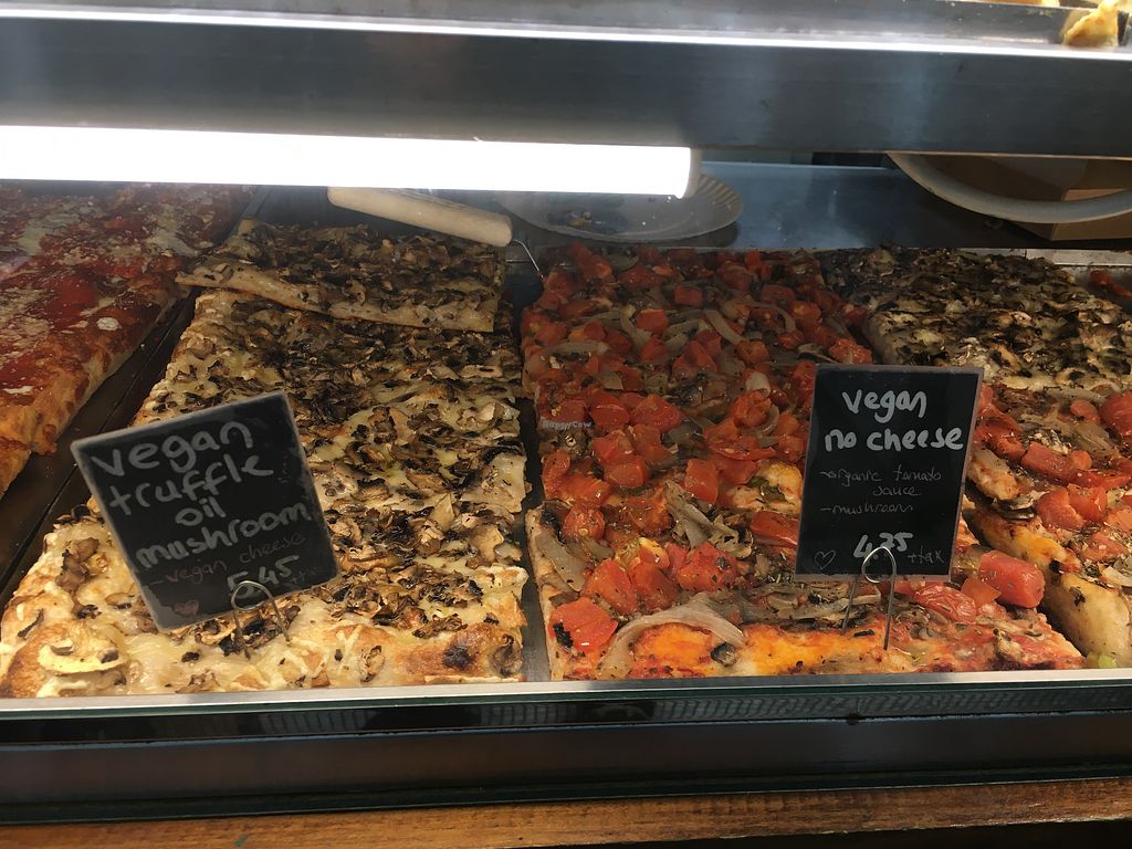 Loved that they have vegan slices! Sadly they're a bit disappointing. The vegan cheese used was not melted AT ALL - it was basically stringy, tasteless shreds that resembled cheese. The veggies on top were great and the square slices are huge but I think they should either not have any vegan cheese at all or learn how to cook it. There were some slices without the cheese so I'd recommend those instead.