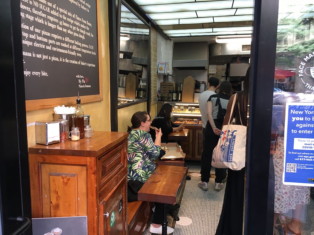 My Pie had some very nice vegan pizzas, more than is shown in their online menu. I had the vegan no cheese pizza. The crust was thin and good. Service was friendly. There is very limited seating in this small shop.