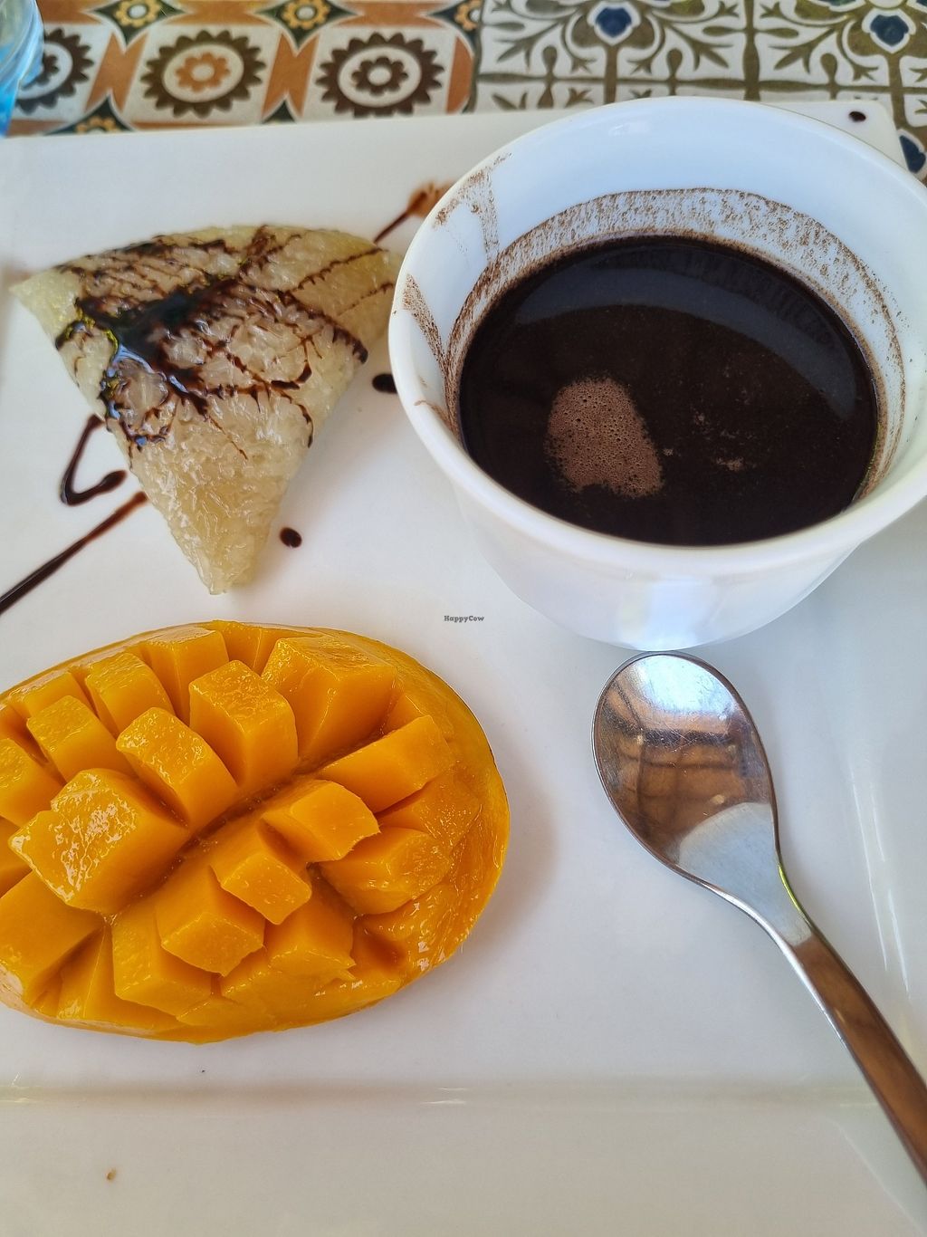 Also für den Kakao würde ich 5 Sterne geben. Leider gab es nur ein veganes Gericht auf der Karte. Ich habe hier Sticky Mango rice mit Schokoladen Soße gefrühstückt! Ach ja und ein sehr leckerer kalter Ananas Smoothie.