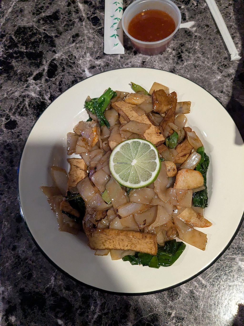 Fried flat rice noodles with eggplant and tofu: $13.50
