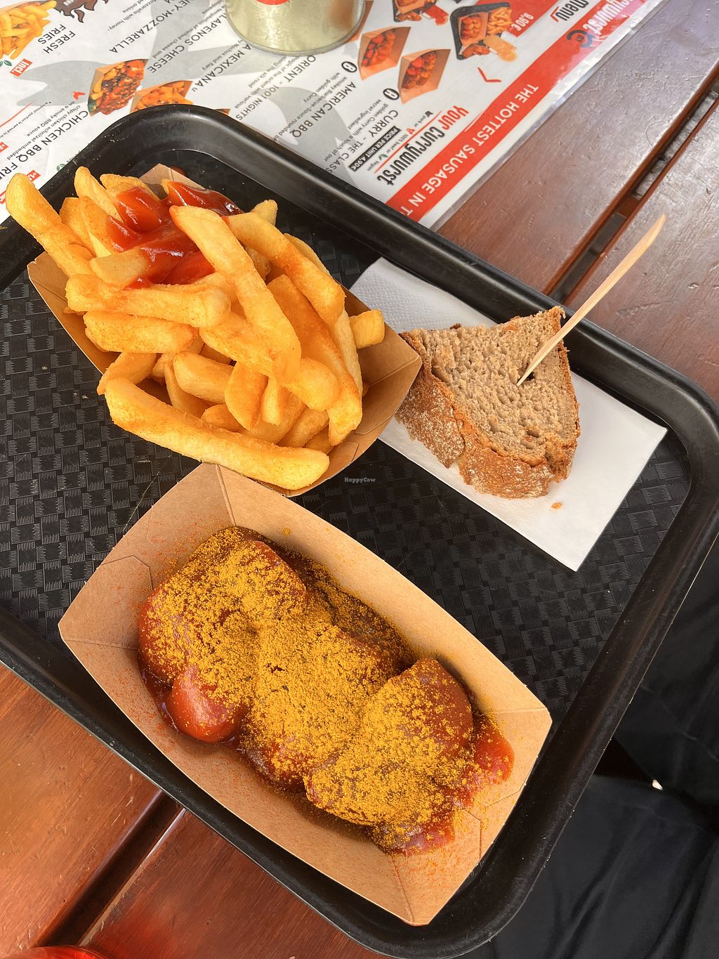 Curry wurst and Pommes place that serves a vegan option. I checked and Vegan sausage is cooked in a fryer that is meat free(meat sausage is cooked on grill). They have vegan mayo and vegan cheese options for fries. It was tasty German comfort food and I’m happy I finally got to have curry wurst again after 25 years of being meat free! #Veganuary