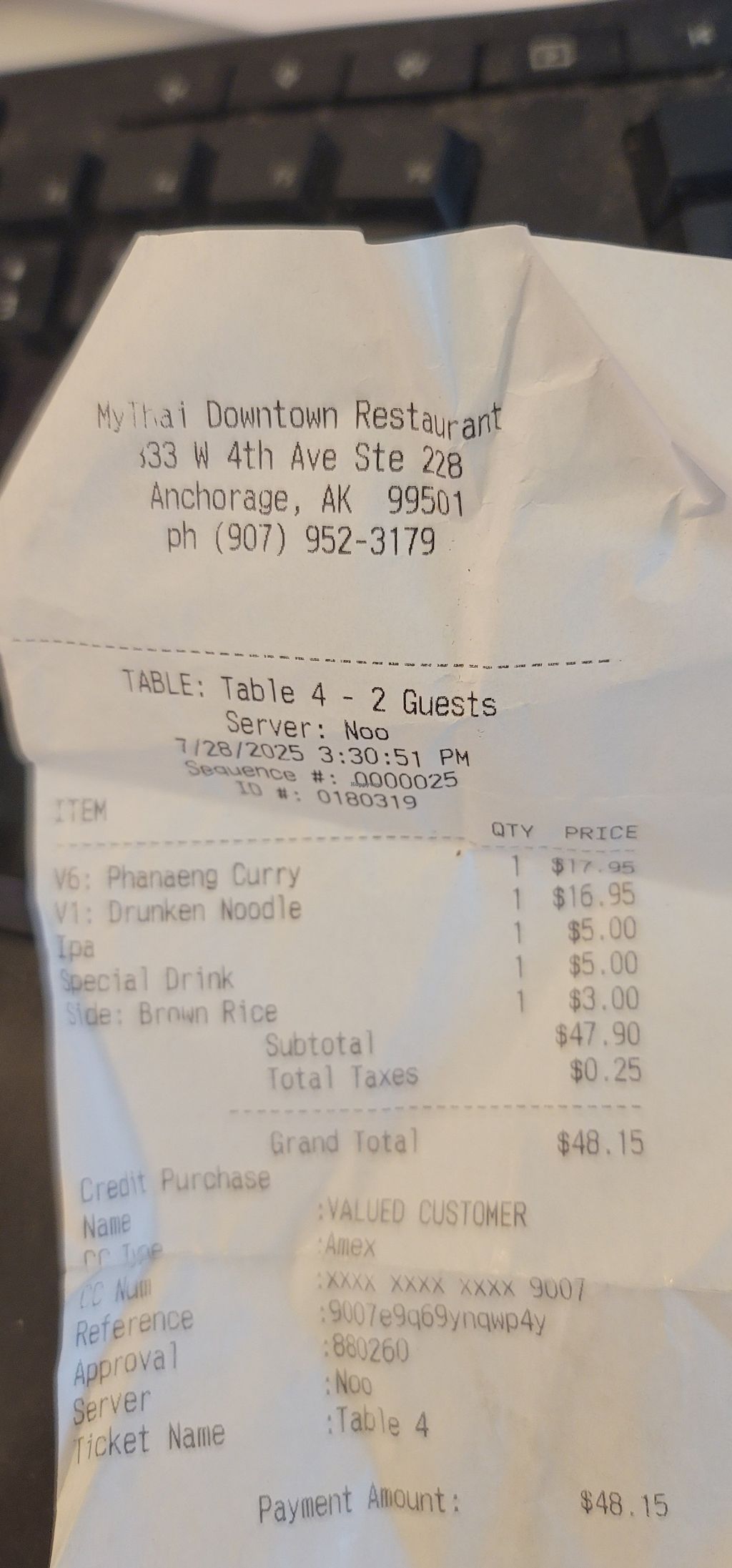 We got the phaenaeng curry and drunken noodles after visiting the Anchorage museum, and it was delicious! We had to add a side of brown rice because it was a little saucy, but the taste was great. We went July 28th, 2025.