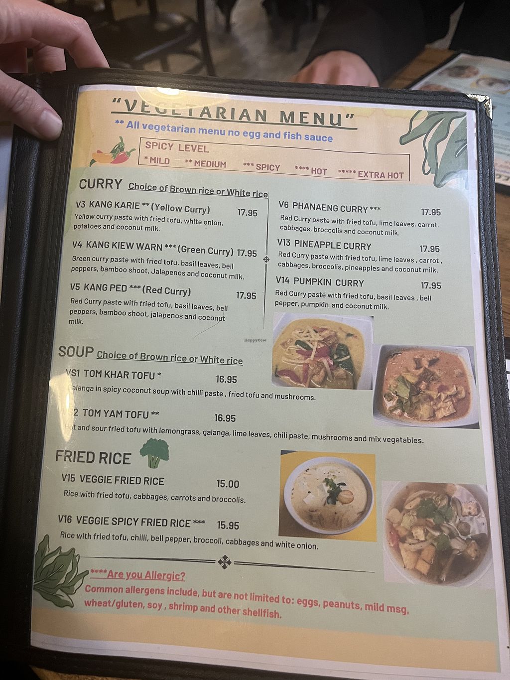 I go here frequently for lunch since I work downtown. They have a separate veggie menu that they will bring. They don't use fish sauce in any of the veg dishes. In other Thai restaurants I always have to ask and regret it if I forget. They also have brown rice, friendly staff and a lovely ambience. It's my go-to restaurant downtown.