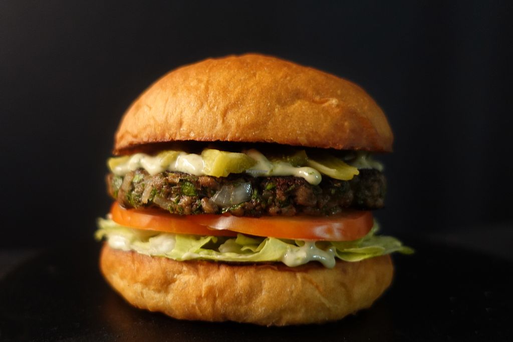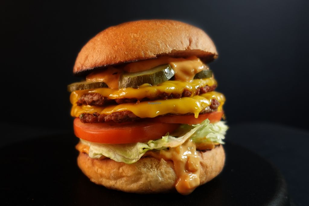 Impossible patty with ketchup, mayo, cheddar cheese, and pickles. Serv…