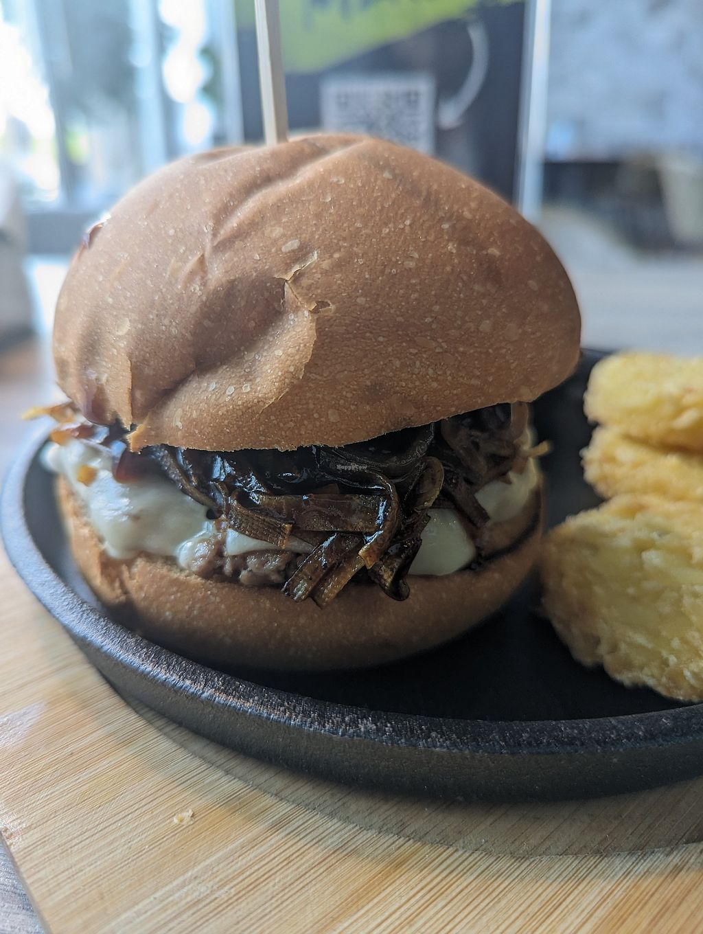 Impossible patty with grilled onions, mozzarella cheese, mayo and cris…