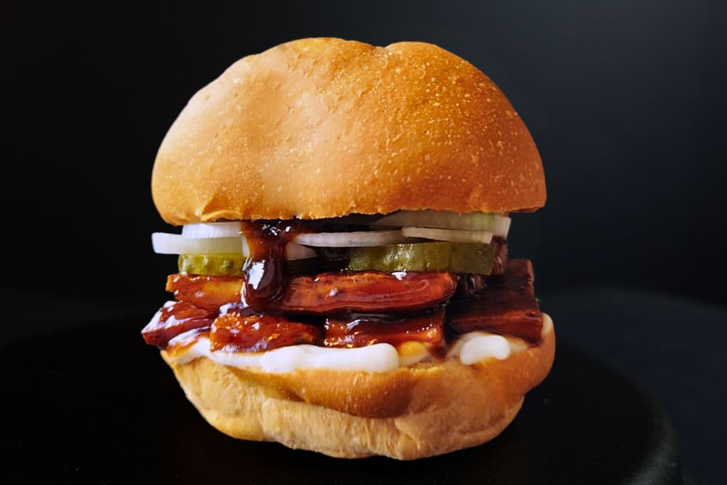 Big juicy Tindle chick'n patty with cheddar cheese, mayo and shredded …