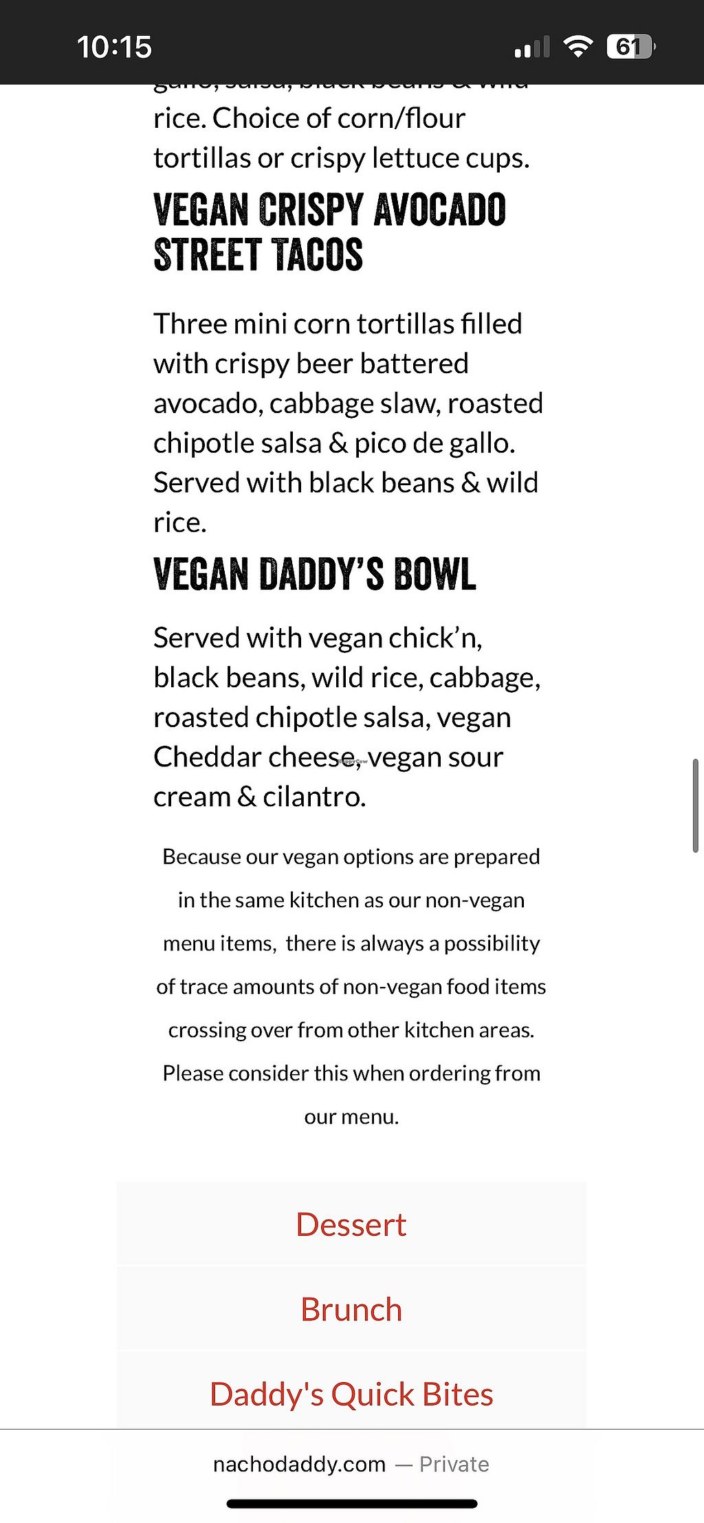 Separate vegan menu featuring burritos. Tacos, quesadillas, chimichangas, enchiladas, salads, etc.