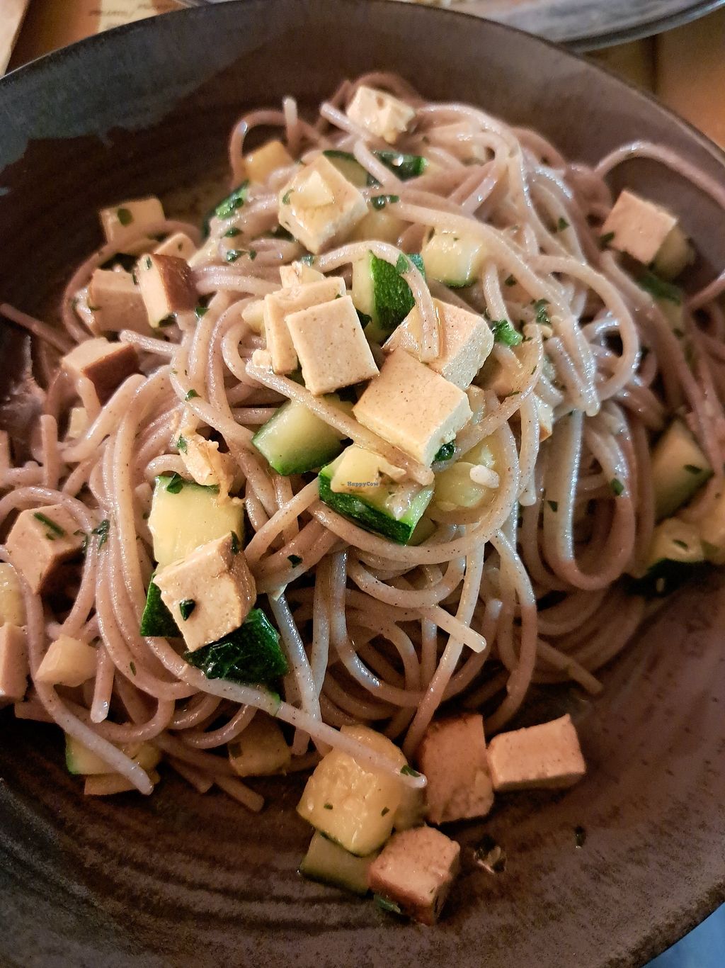 Whole wheat tagliatelle with smoked tofu, courgettes, and ginger