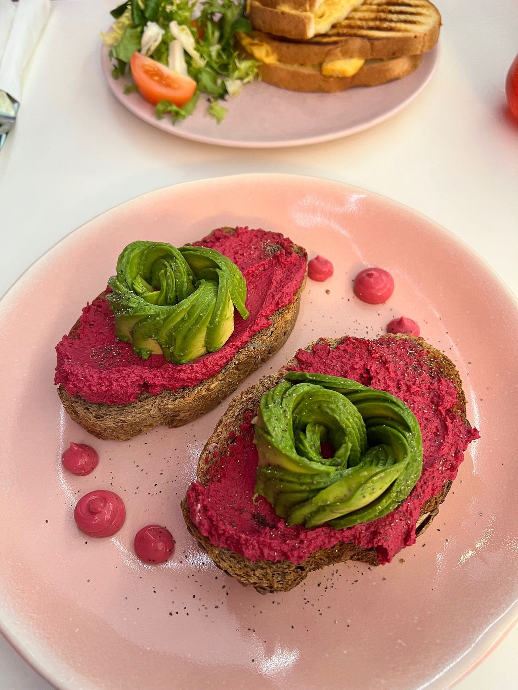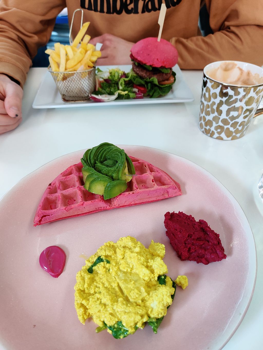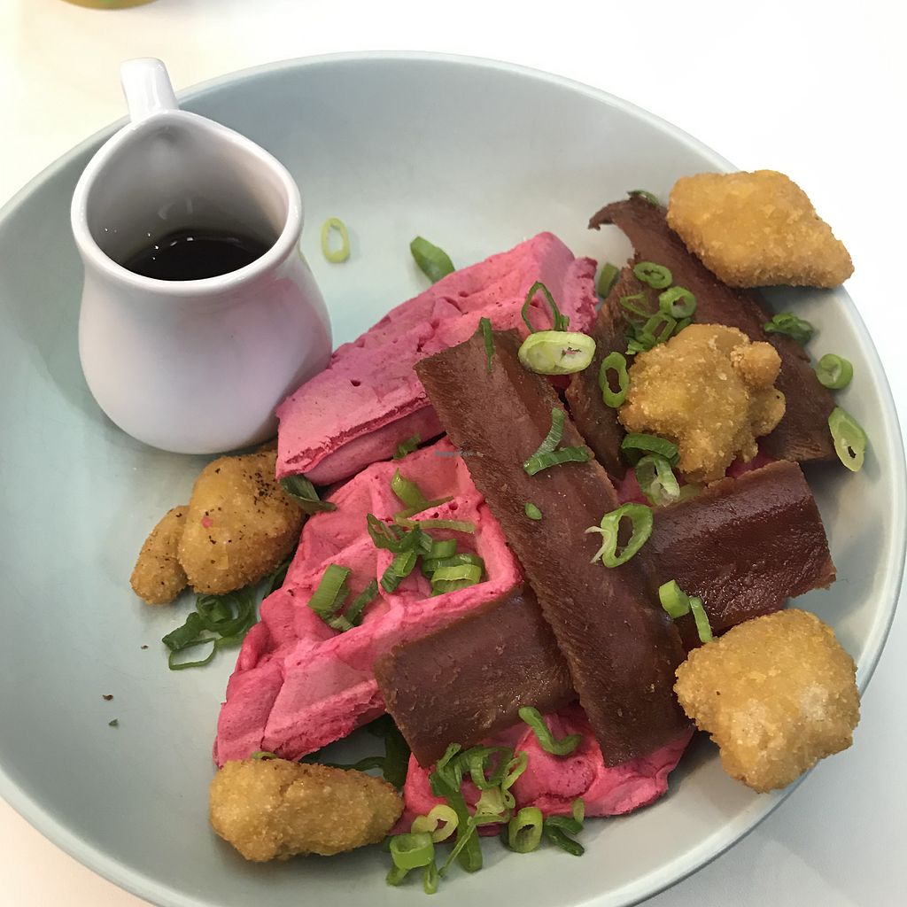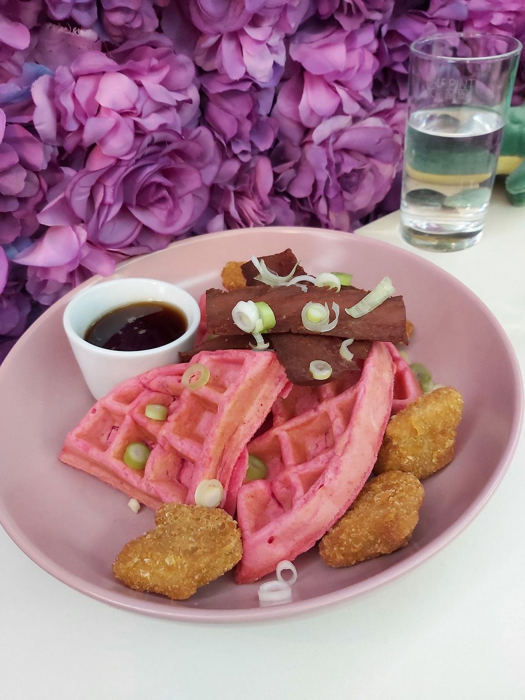 Pink waffles with chicken & bacon