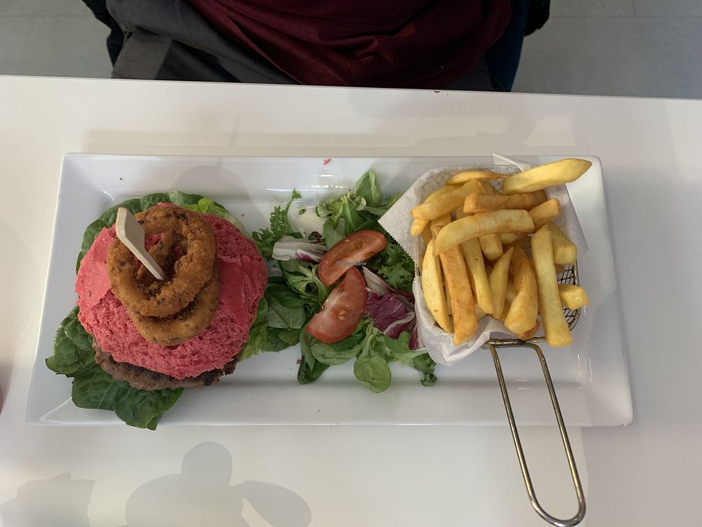 Cheese burger with bacon served on a beetroot bun and a side of chips,…