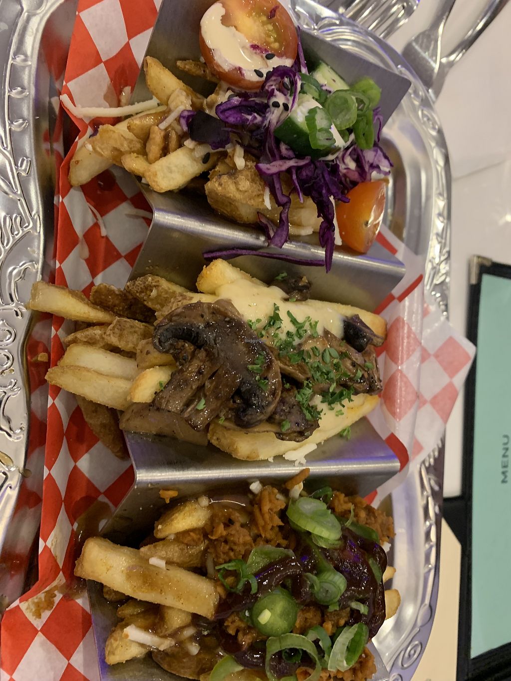 Hero shot of Pad Thai, Kale Caesar Salad and Poutine