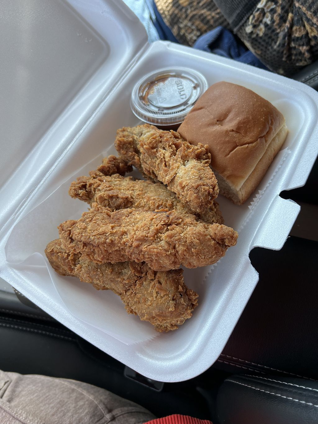 Atlas Monroe chick’n tenders with bbq sauce and roll…reminds me of Coo…
