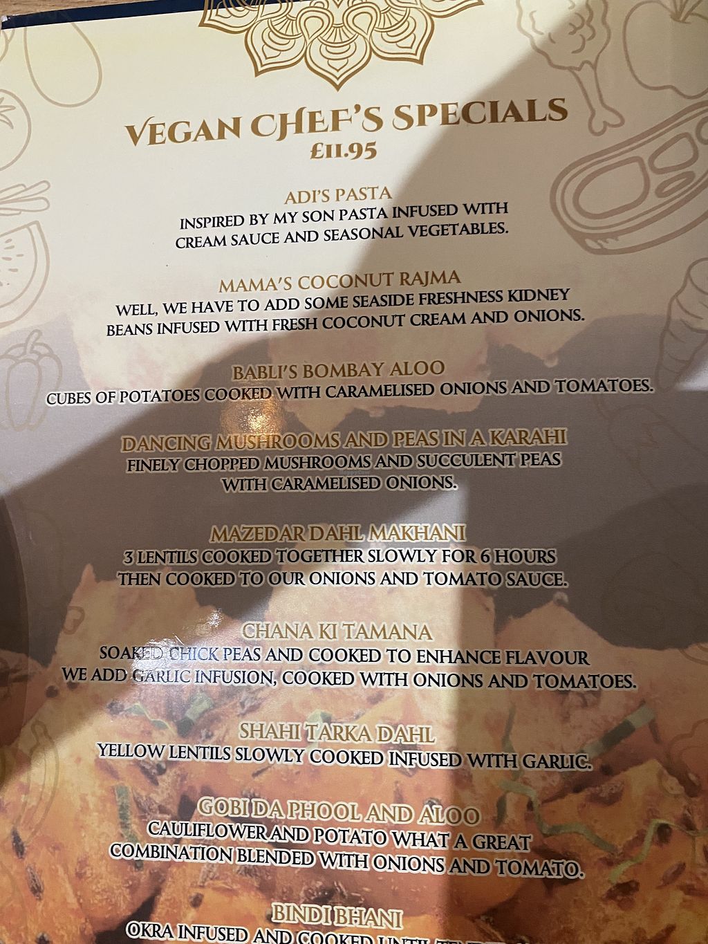 A HUGE vegan menu. Loads of options. HIGHLY recommend. Got a few dishes to share, dhal makhani was my fave. They also tailor to your spice level. We asked for extra spicy and they actually made it extra spicy! Lovely staff and decor is nice too!