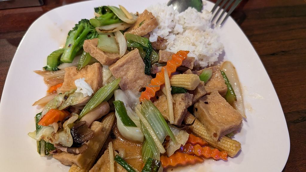 Serves meat, vegan options available. Thai restaurant with vegetarian dishes that can easily be made vegan upon request. Offers edamame, vegetable sushi rolls, fresh spring rolls, noodles and more. Specify no egg or fish/oyster sauce when ordering. Open Tue-Fri 11:00am-2:30pm, 3:30pm-8:30pm, Sat-Sun 2:30pm-8:30pm. Closed Mon.