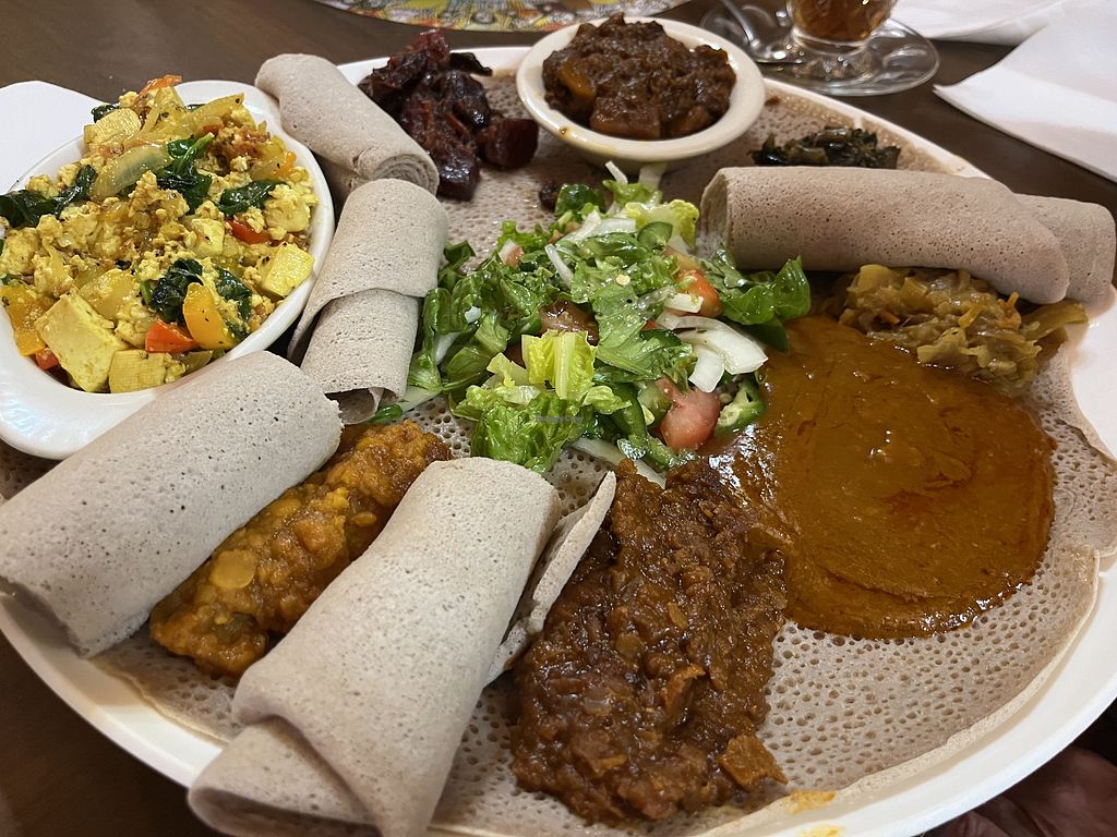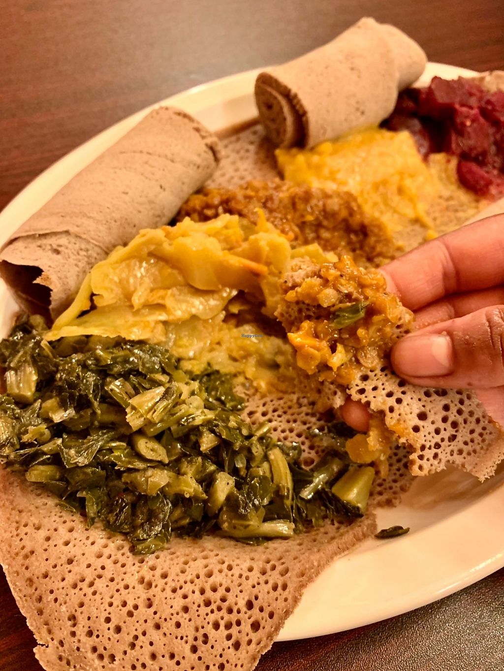 Veggie Combo platter (L-R): Collard greens, cabbage + potatoes, red le…