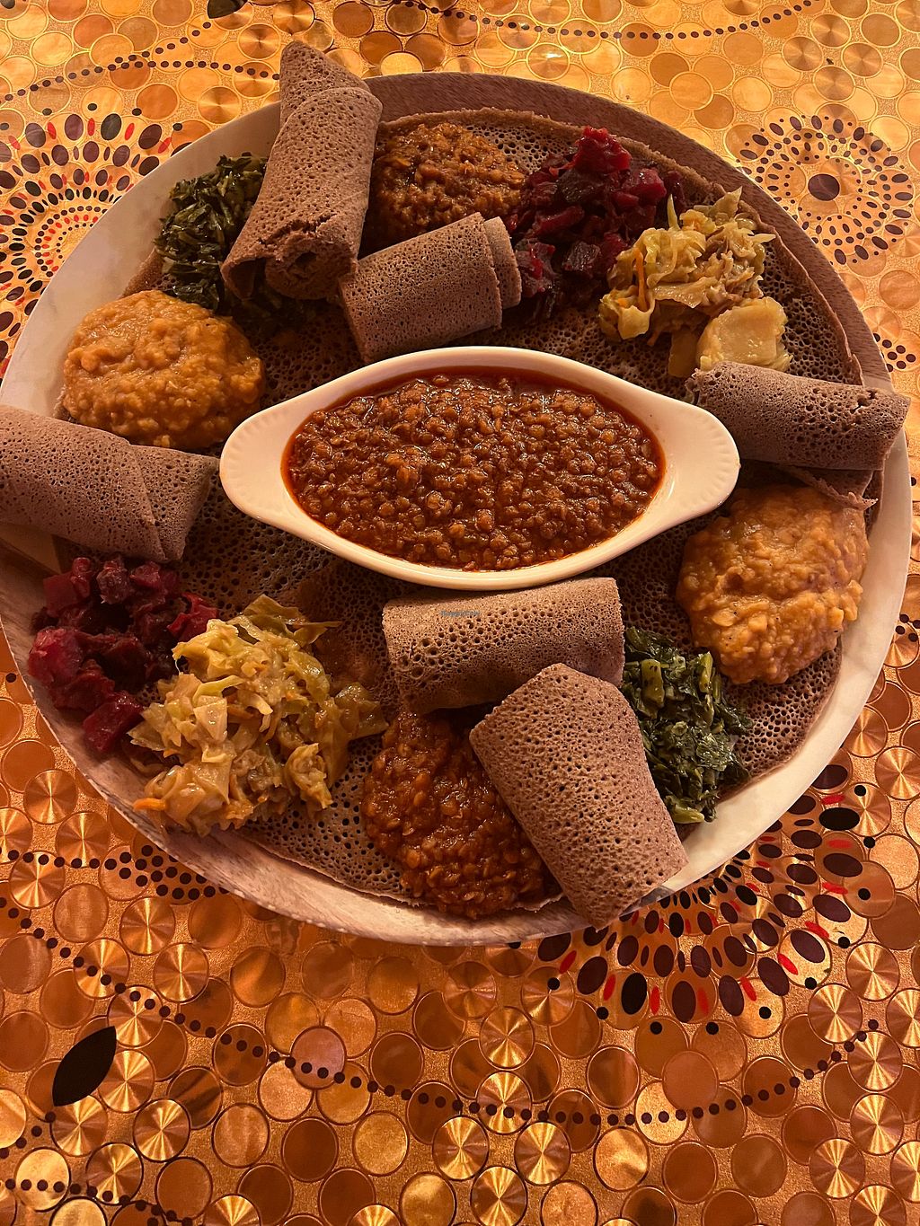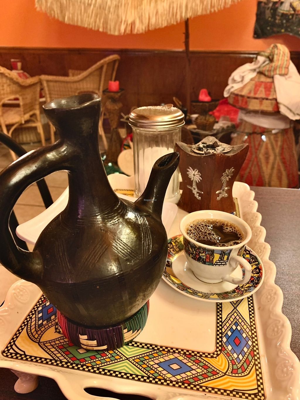 Ethiopian coffee experience, served on a decorative tray with burning …