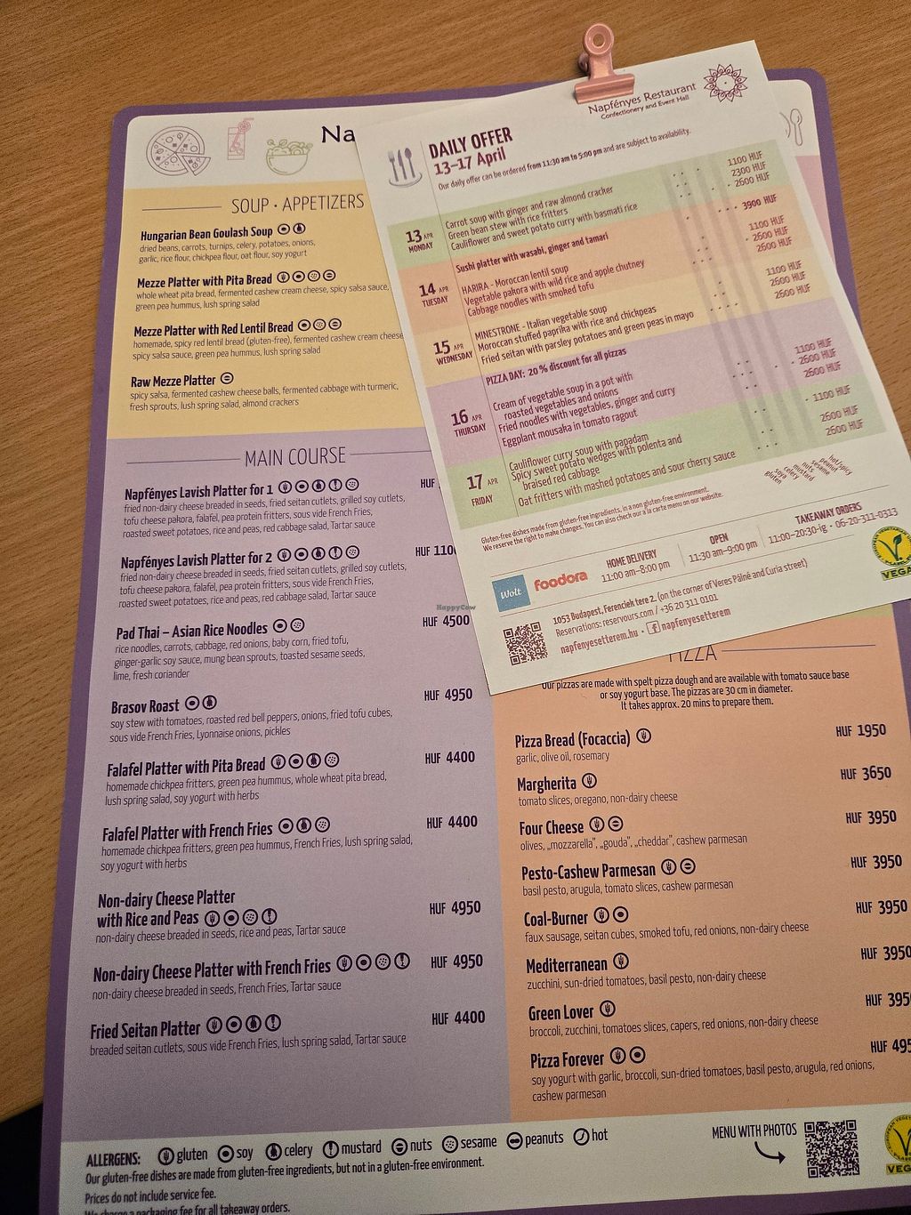 Visited on 26th, 28th & 30th May 2010. This is one of the finest Vegan restaurants I've ever been to! The menu contains 2 soups, 5 mains including traditional Hungarian meals minus the meat, 7 sides, 8 very inventive pizzas, a self service salad bar, a huge selection of cakes that are also available to take away, various teas, organic coffies, homemade juices & lemonades and a seperate specials menu with 4 meals that change daily. They don't serve alcohol. The portions are huge and it's very affordable. The restaurant is below street level and has a great atmosphere, the staff are very helpful and friendly. If in Budapest this place is essential!!!!