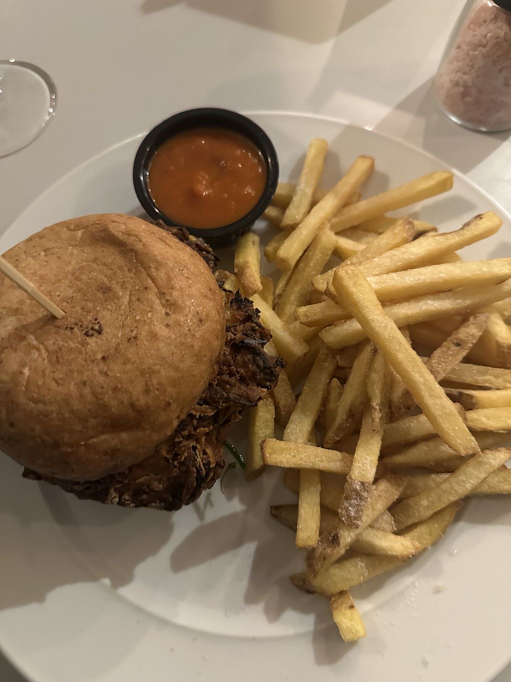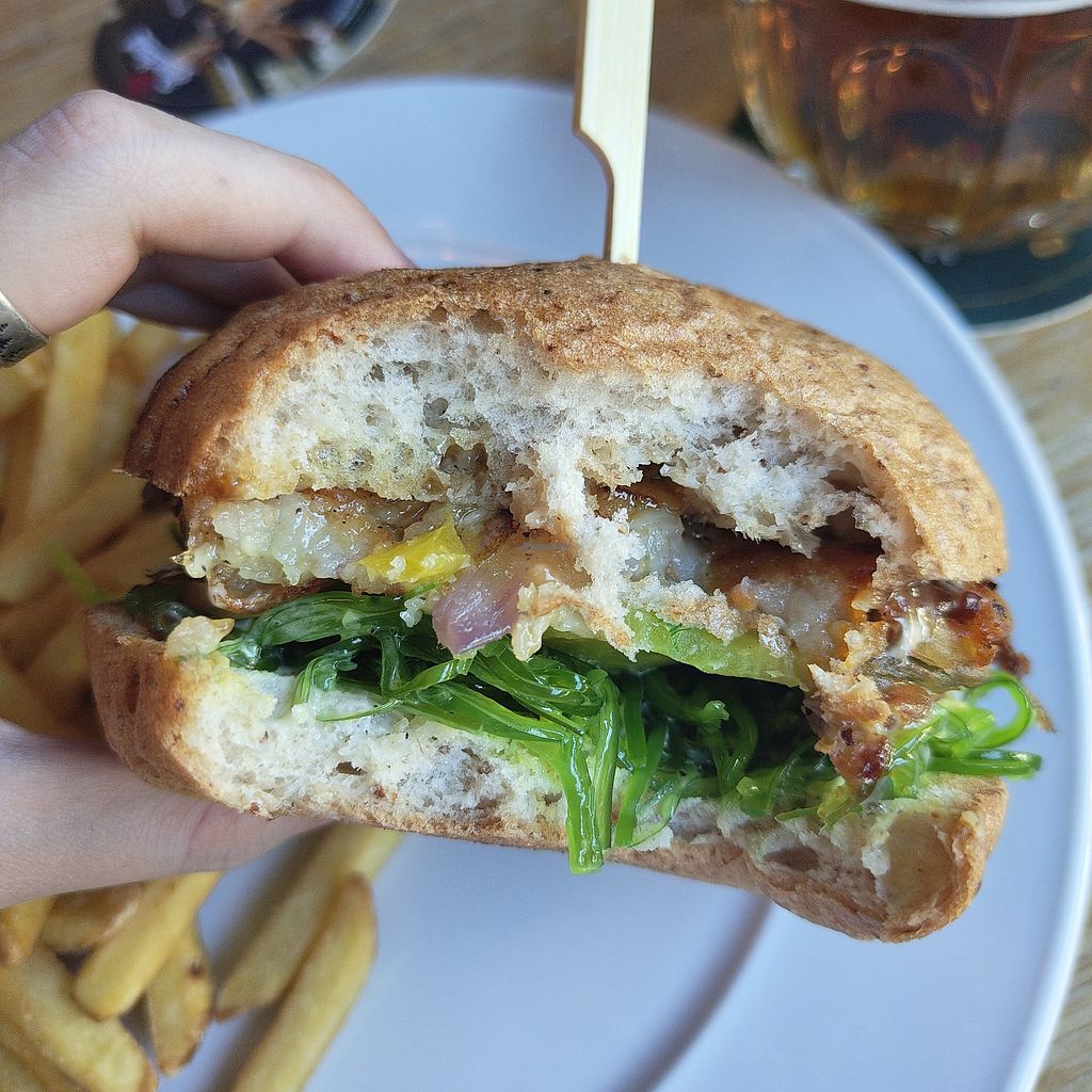 אין הרבה אופציות בתפריט, 3 או 4, אבל מסומנות בצורה ברורה. ההמבורגר היה מיוחד, מין קציצת ירקות עם רטבים מיוחדים ואצות. קצת שומני מדיי, הצ׳יפס מעולה ודווקא לא מרגיש שומני. פעם באה אנסה משהו אחר, היה המבורגר מיוחד אבל לא ברמה של לחזור בשבילו.
