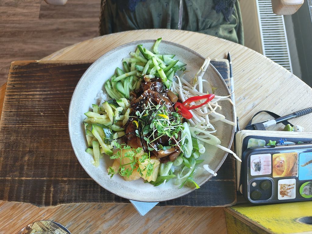 There were only very few vegan options, and the one I got was rather expensive, but quite good tasting: fresh ingredients, good combinations, well-cooked rice, and such. The presentation of the food was quite nice, too.