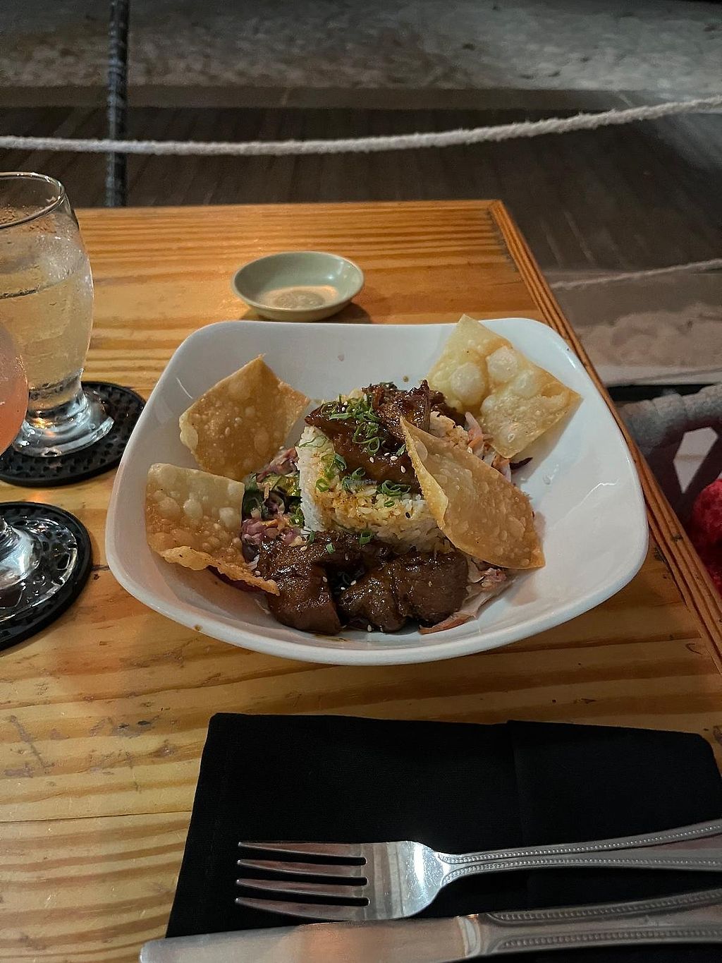Crispy mock duck with veg and rice
