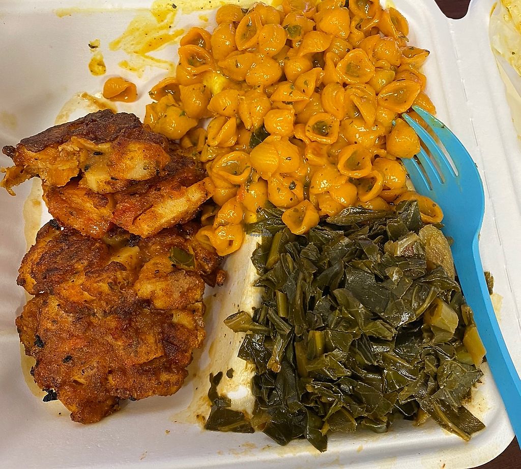 Salt fish fritters with Mac n cheese and collards 😋