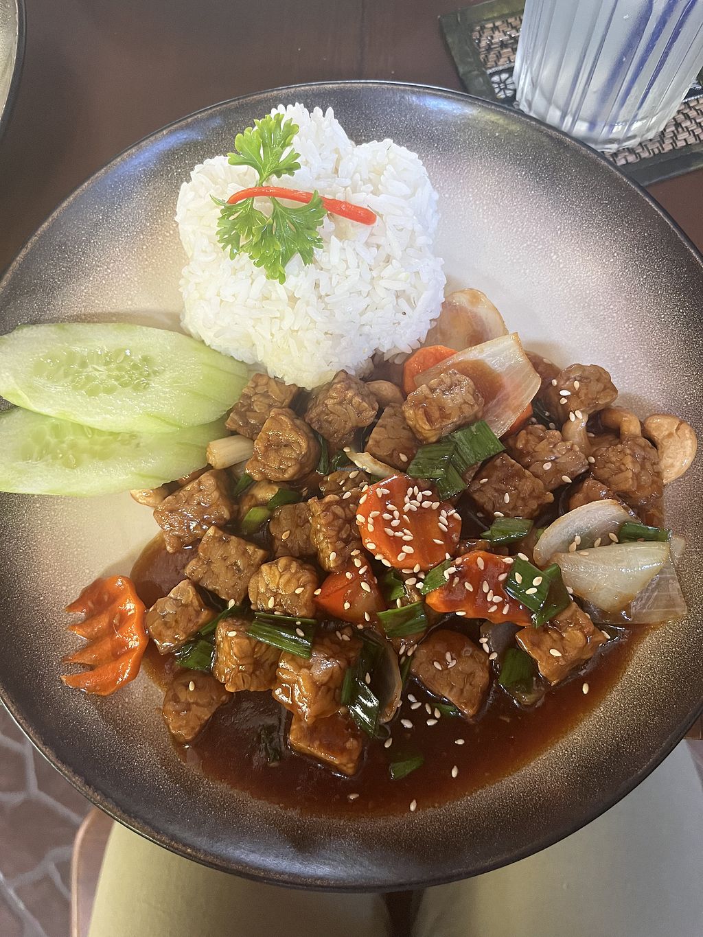 We ordered spring rolls, cucumber salad (papaya salad wasn’t available), tom yum with tofu, tom kha with tempe. Everything was delicious, great balance of flavors. We ordered level 2 spicy. Next time husband (Javanese) wants level 3, for me level 2 was just right for “comfort food”. We finished it all. No fresh herbs (cilantro, basil, etc), not sure why Indonesian restos often lack them, would make dishes even better. Almost everything on the menu has a vegan version, which is great.