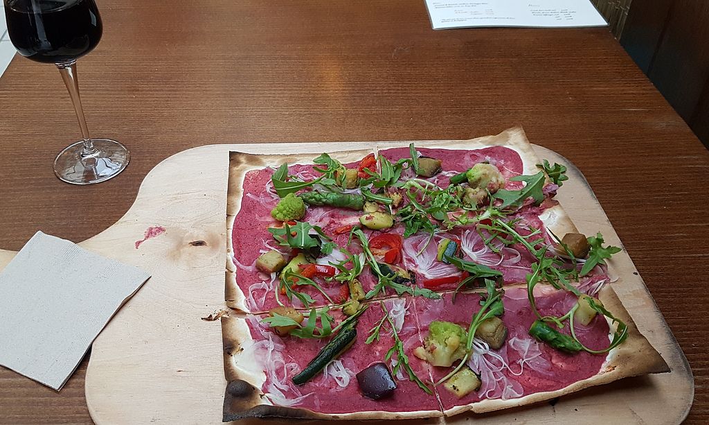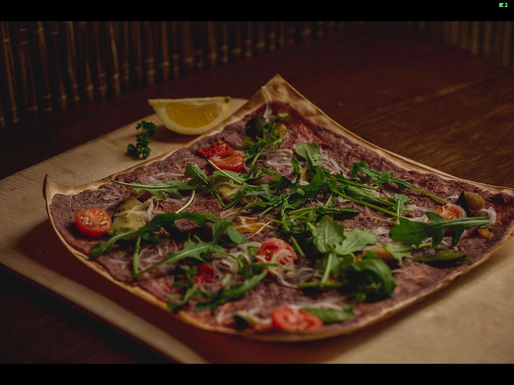 A small, somewhat out-of-the-way (which is very nice in over-crowded Carcassonne), restaurant offering vegan flammekueche (listed under 'Sallees' on the menu) - a thin-crust type of square pizza. We had the one with the beetroot base.